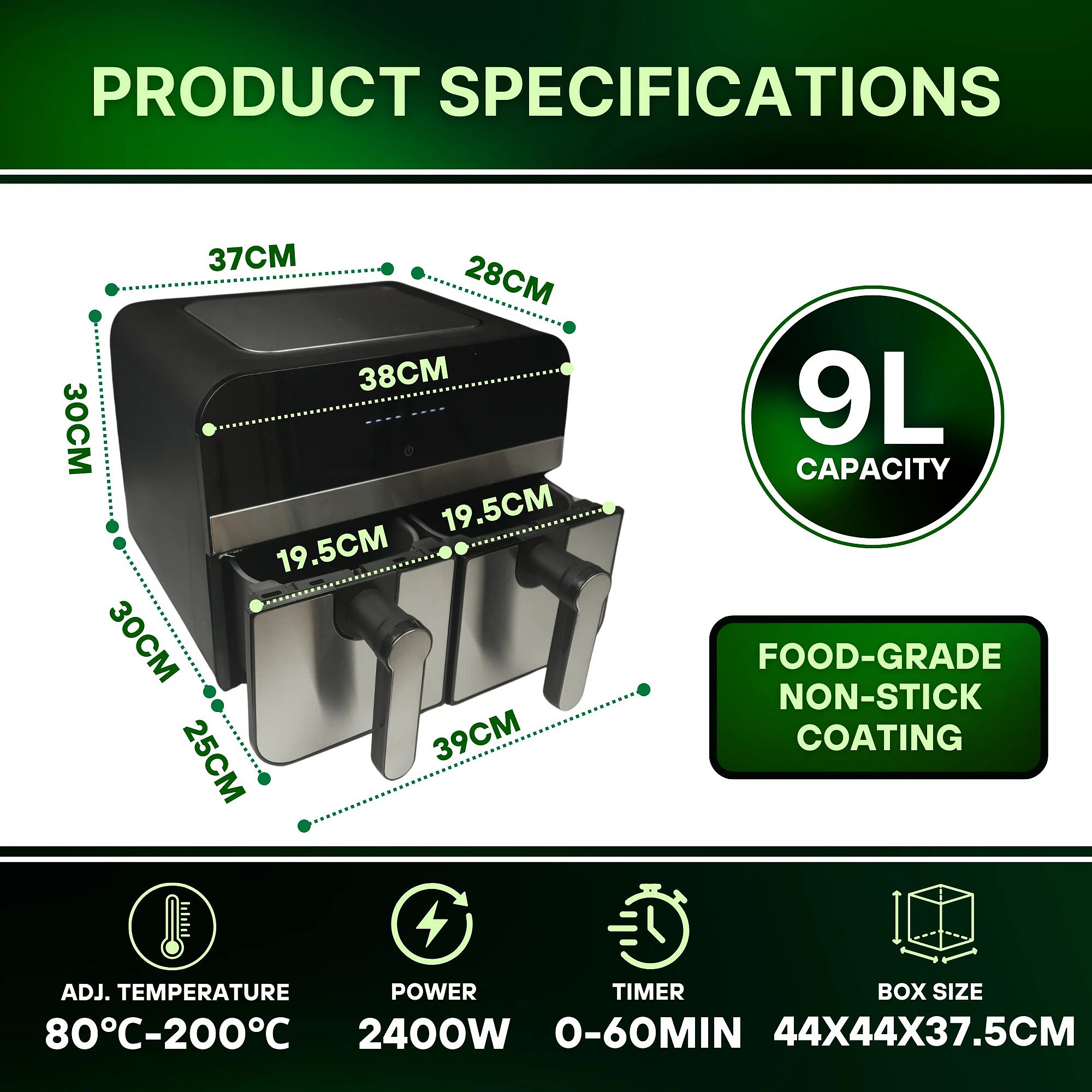 - Capacity: 9L (2 Independent 4.5L)