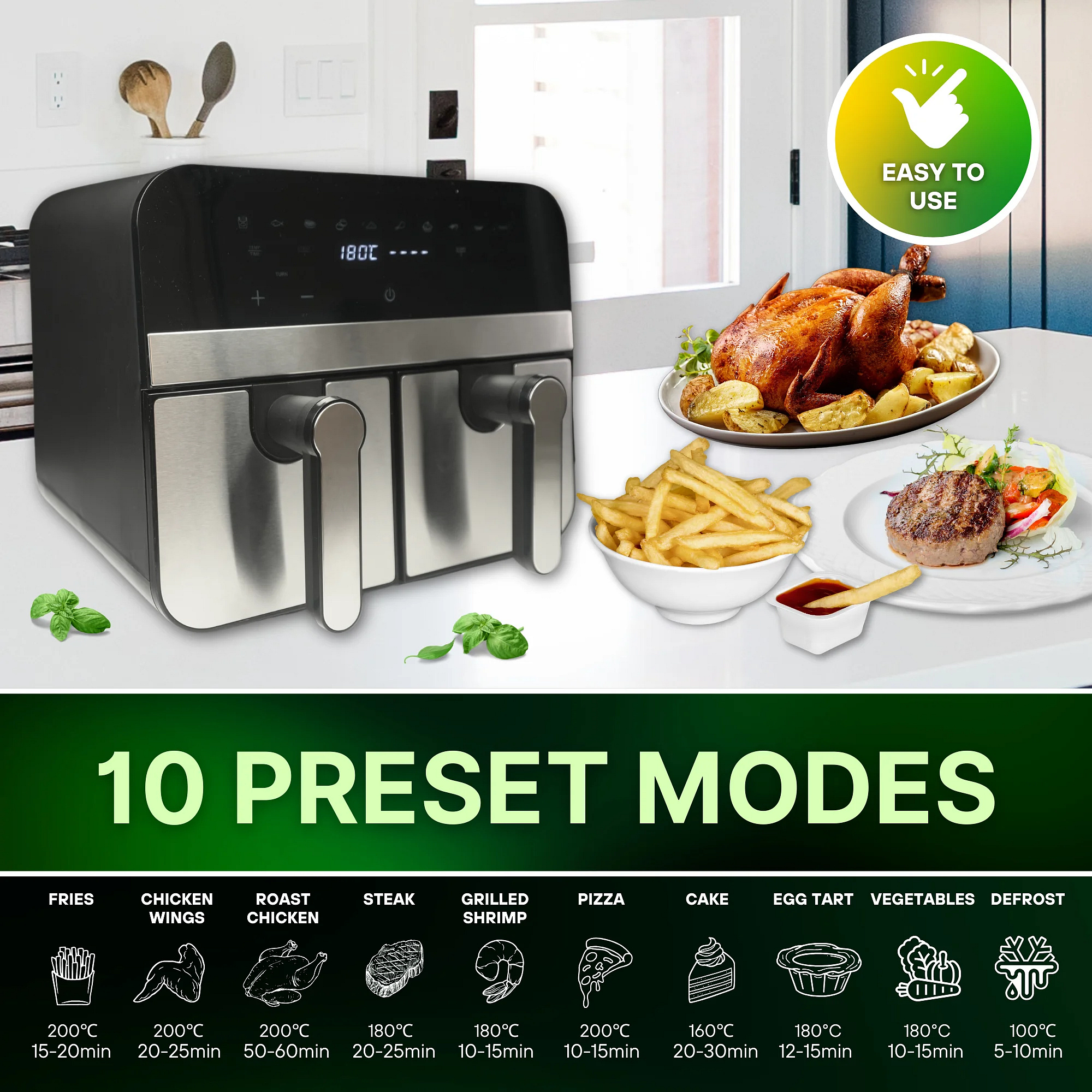 - 10 Cooking Functions – With 10 preset programs tailored for different foods, like French fries, chicken, and vegetables, you can select a cooking setting with one touch. These functions are optimized for various recipes, eliminating the need for guesswork and delivering consistent results with each dish.