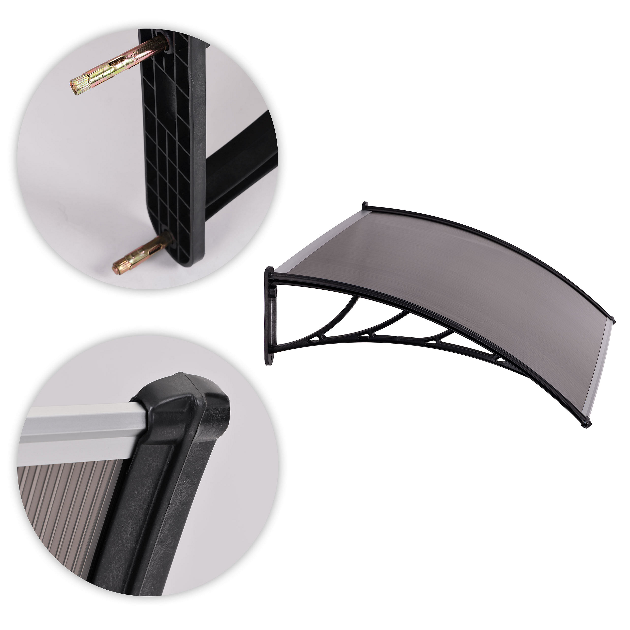 The canopy should be installed using the included durable metal anchors. The 4-point mounting system ensures a strong and secure connection to the building wall. The set includes special metal anchors in three lengths: