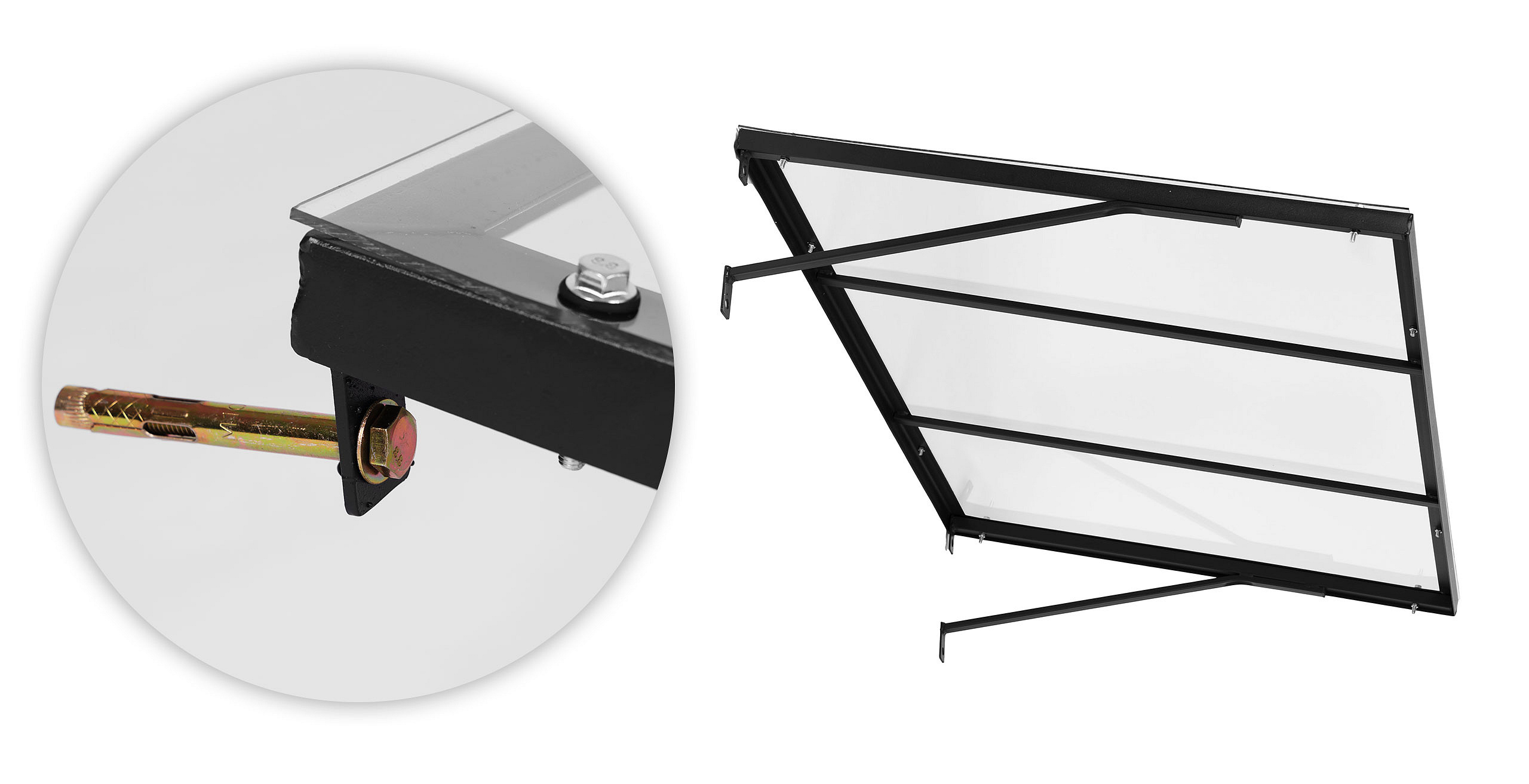 Stable mounting points are designed for safe installation above entrance doors. Properly positioned holes allow the canopy to be firmly attached to the building wall. The set includes four 8.5 cm anchors, ensuring secure installation and quick assembly without the need for additional components.