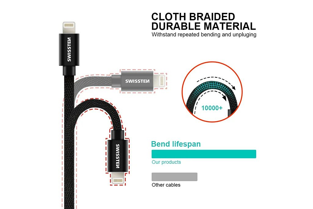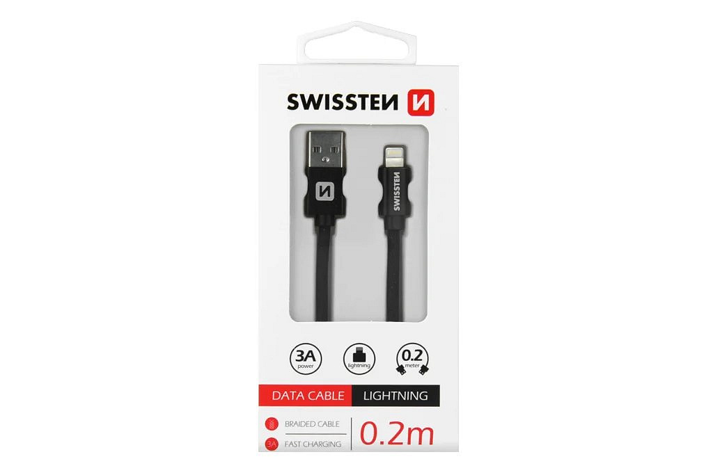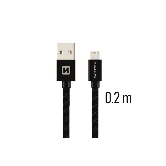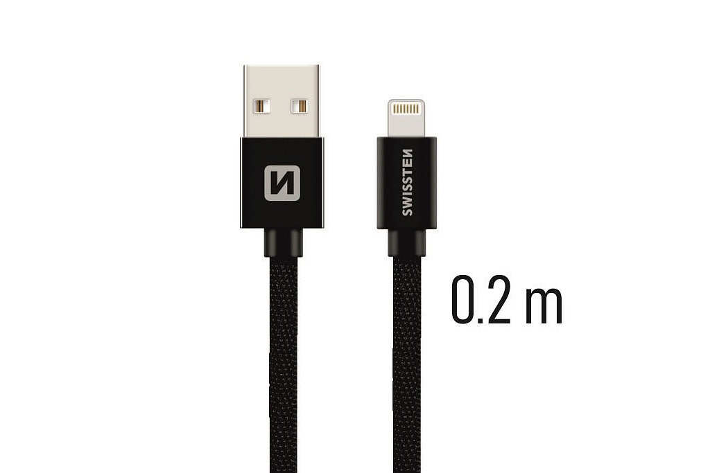 Datový kabel Swissten USB/Lightning s kvalitním textilním opletením a kovovými kryty konektorů. Díky délce 0,2m je vhodný především k nabíjení z power bank či notebooků. Kabel je zesílený a přenese tak větší proud (až 3A) a zvládne i rychlý přenos dat 480 Mb/s. Životnost kabelu v ohybu je více než 10000 ohybů. Kovový kryt konektoru je odolnější proti mechanickému poškození než běžné plastové kryty konektorů.