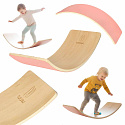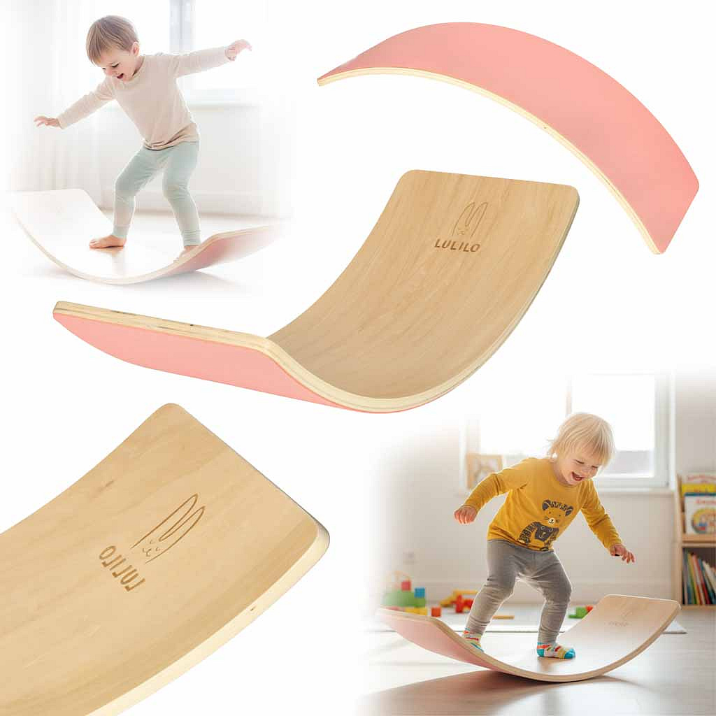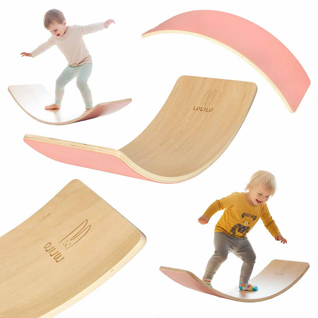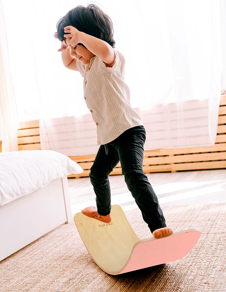 DŘEVĚNÁ DESKA NA BALANCOVÁNÍ PRO DĚTI S RŮŽOVÝM FILCEM – CVIČENÍ PROPRIOCEPCE