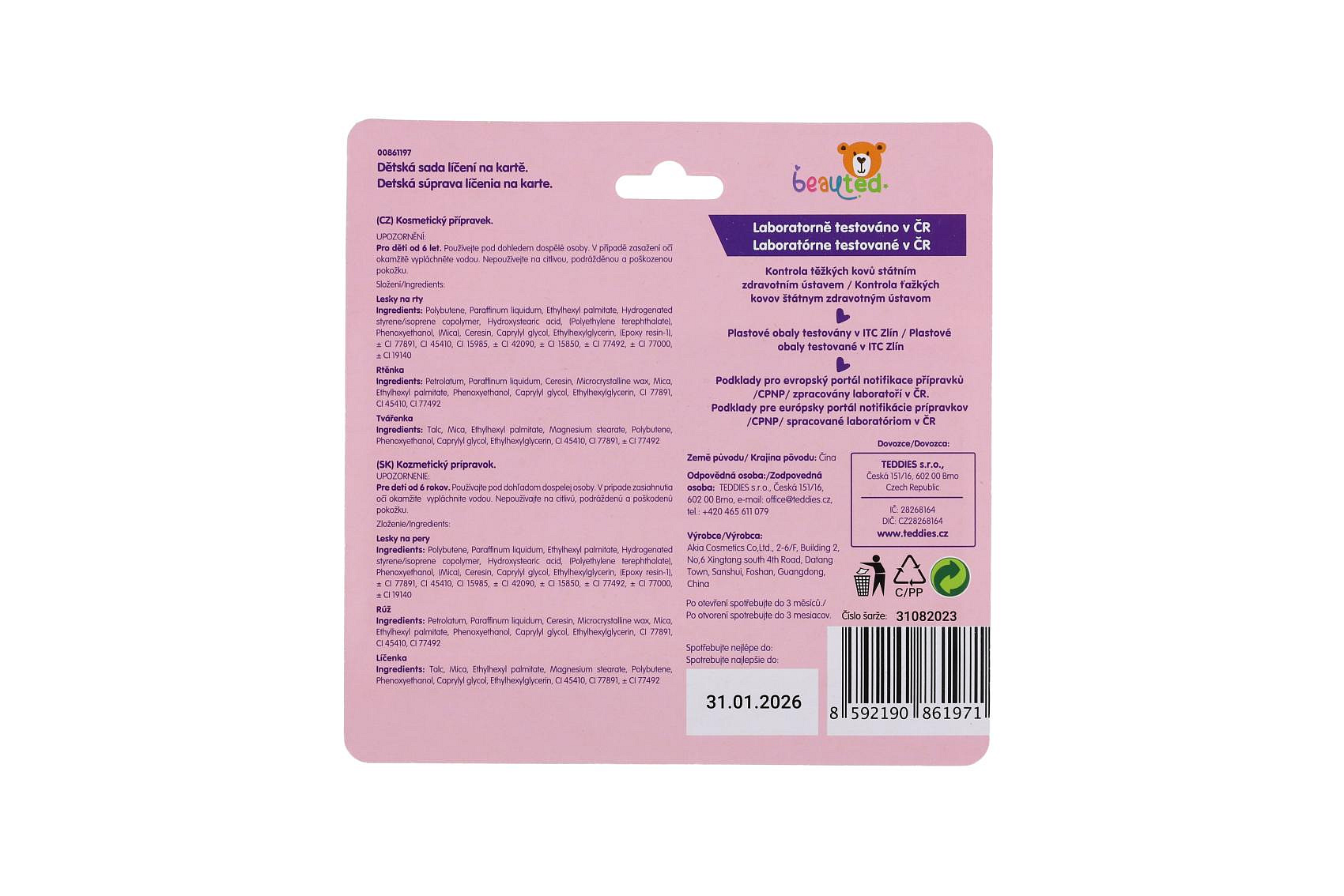 Vítejte v hravém a bezpečném světě kosmetiky značky beauted. Malé holčičky se začínají seznamovat se světem krásy již od raného dětství a brzy je zajímá vše, co jejich maminky používají. Značka beauted je k objevování kosmetiky jako stvořená. Produkty této řady jsou navrženy tak, aby byly hlavně bezpečné, ale také hravé a inspirativní. Podpoří kreativitu a představivost, umožní rozvíjet a formovat smysl pro estetiku a krásu. Ať už vaše děti chtějí zazářit jako v pohádce nebo si jen tak hrát, značka beauted jim pomůže udělat každý okamžik v jejich dětství ještě více nezapomenutelným. Jejich den se může proměnit v zábavnou cestu do světa barev a lesku. Značka beauted je laboratorně testovaná v České republice. Kontrola těžkých kovů je prověřena státním zdravotní ústavem, plastové obaly jsou testovaných v ITC Zlín. Podklady pro evropský portál notifikace přípravků /CPNP/ jsou rovněž zpracovány laboratoří v ČR. Certifikace v České republice zaručuje kvalitu a bezpečnost, aby rodiče mohli mít jistotu, že produkty značky beauted jsou kvalitní, bezpečné a šetrné k dětské pokožce. Rozměry balení 17 x 17 x 2 cm. Vhodné pro děti od 6 let.