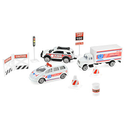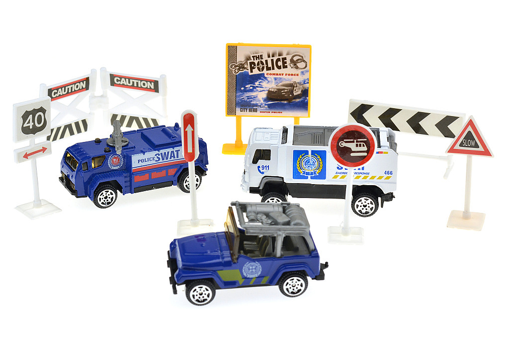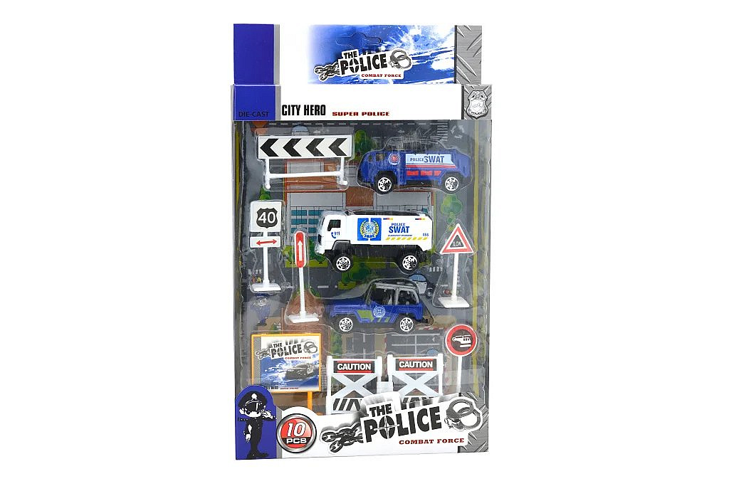 Máte doma malého policistu? Pak ho jistě potěší tento hrací set, kde nalezne policejní jeep, SWAT auto, SWAT auto s hadicí na rozhánění demonstrací, značky i různé druhy ukazatelů a zábran. Velikost balení je 17 x 4 x 24 cm
