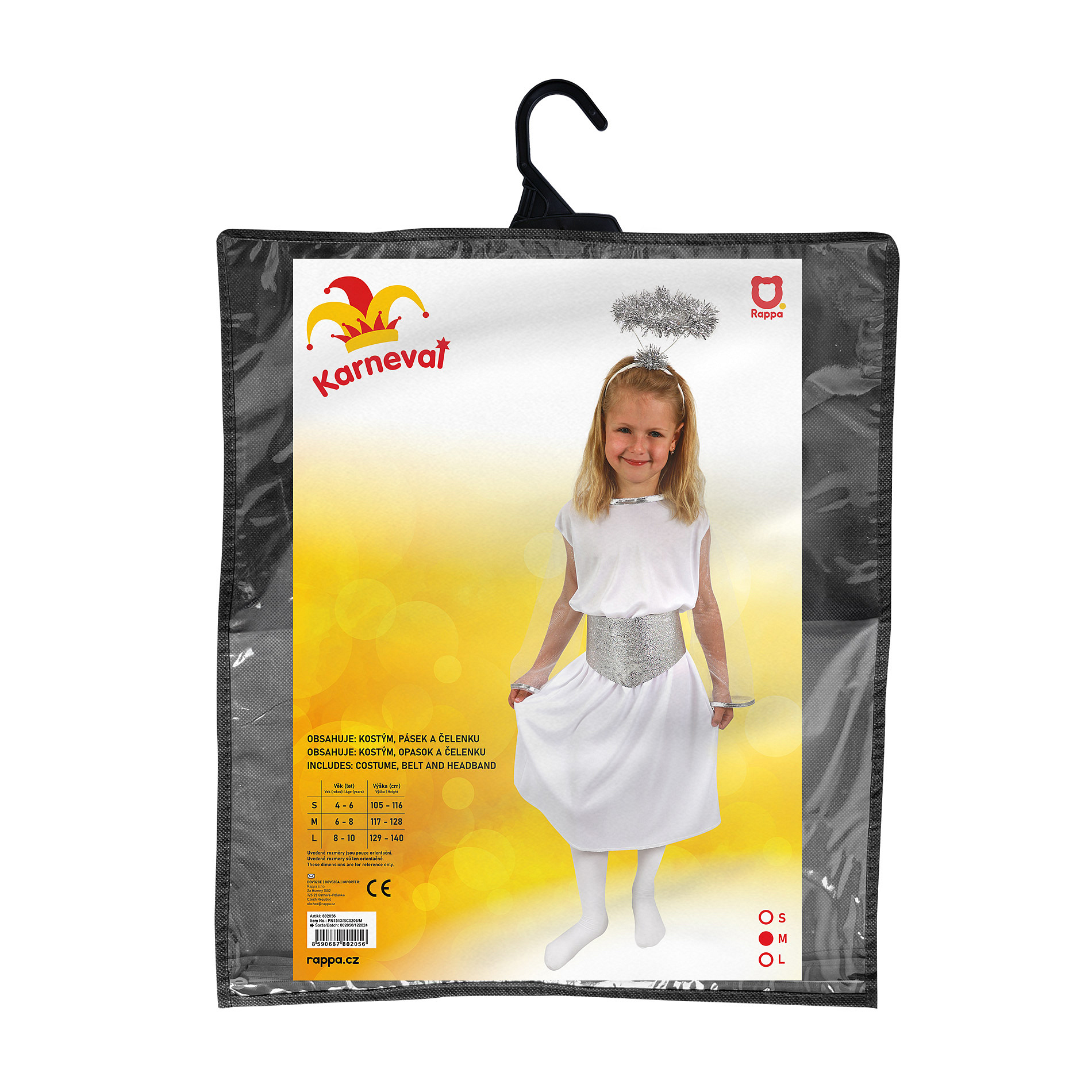Půvabný karnevalový kostým s motivem anděla ve stříbrno-bílé barvě a velikosti M je určen pro holčičky ve věkovém rozmezí 6-8 let (116-128 cm). Balení obsahuje svatozář, pásek a šaty.
