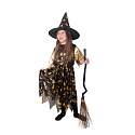 Halloweenský kostým pro malé čarodějnice! Kostým černo-zlaté barvy ve velikosti S je určen pro holčičky ve věkovém rozmezí 4-6 let (105-116 cm). Šaty jsou dekorovány zlatými halloweenskými motivy. Součástí kostýmu je perfektně sladěný čarodějnický klobouk. S tímto úchvatným kostýmem se zaručeně staneš hvězdou karnevalu i Halloweenu! Koště není součástí balení.