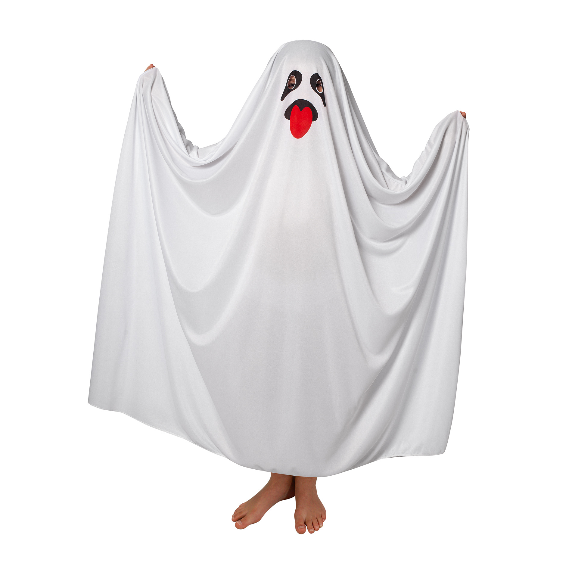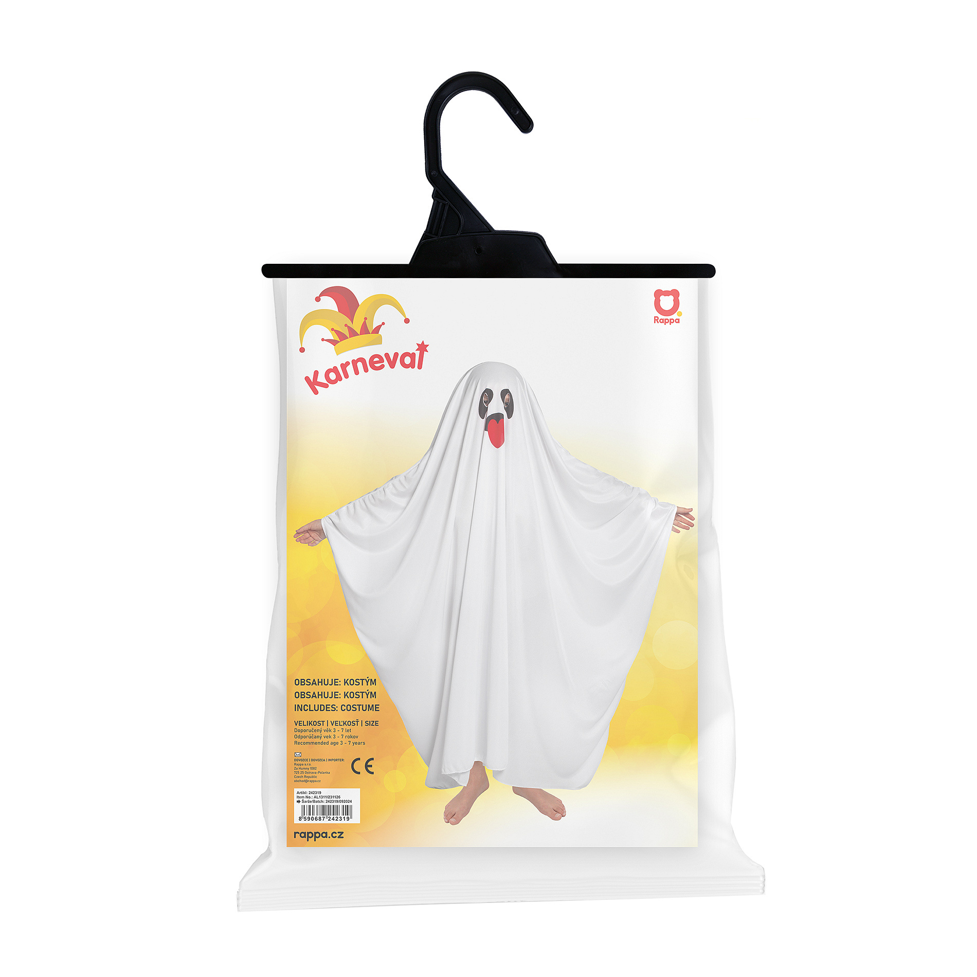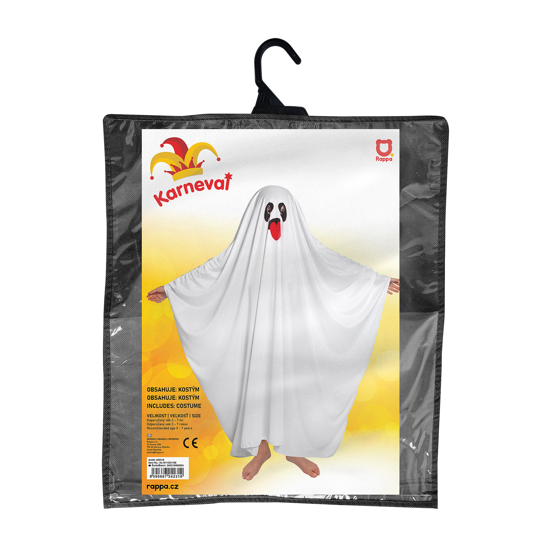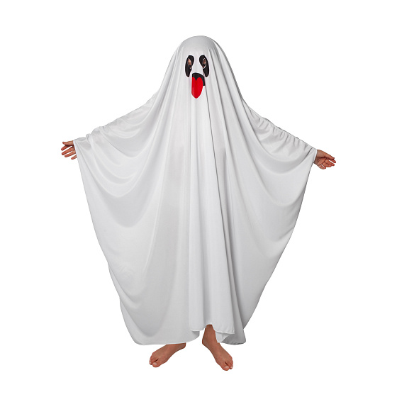 Zahalte se do tajemné a strašidelné atmosféry s naším karnevalovým halloweenským kostýmem ducha! Vhodný pro chlapce i dívky ve věku 3-7 let. Kostým je vyroben z lehkého materiálu a zdobený roztomilým vzorem obličeje s otvorem na oči. Délka kostýmu od hlavy je cca 106 cm.