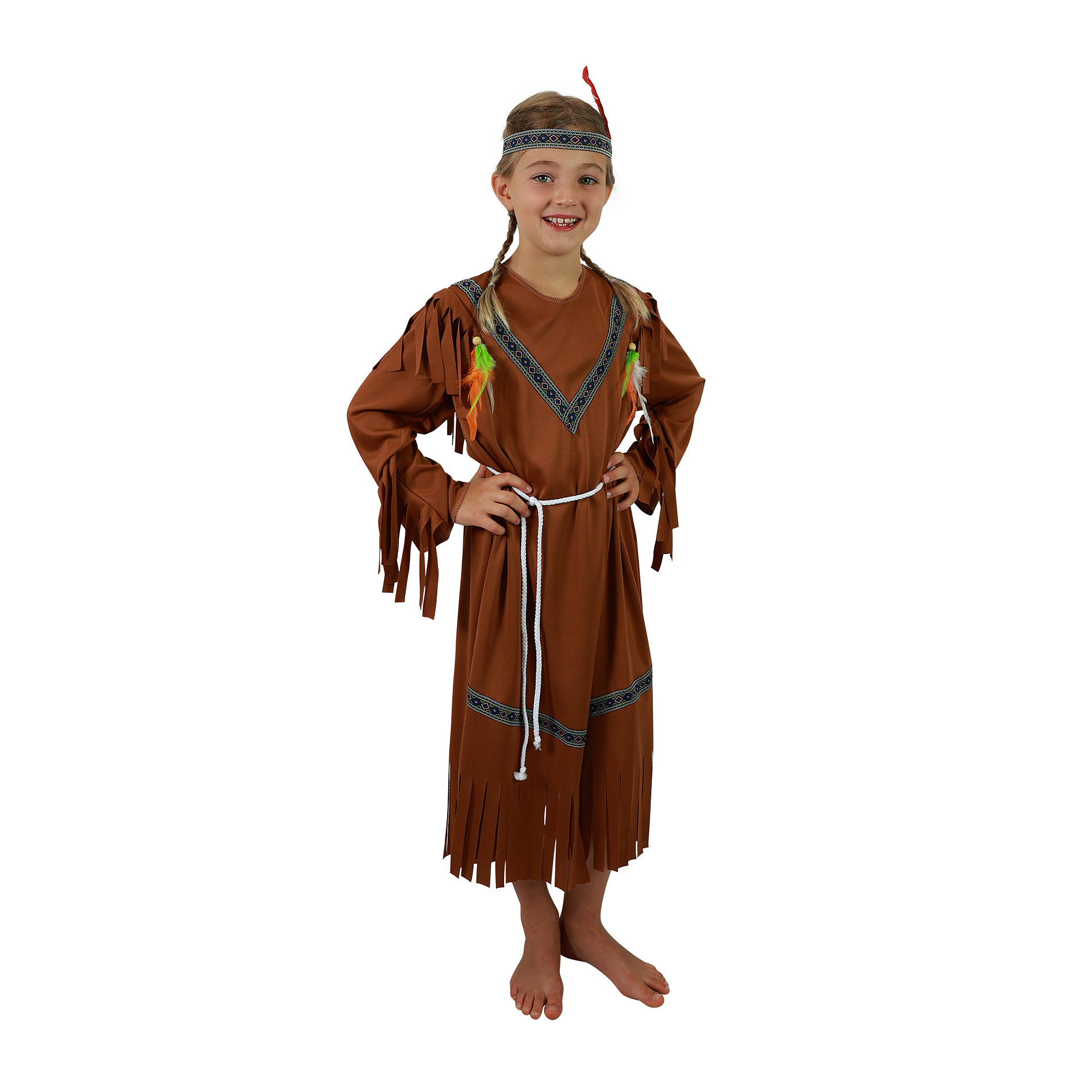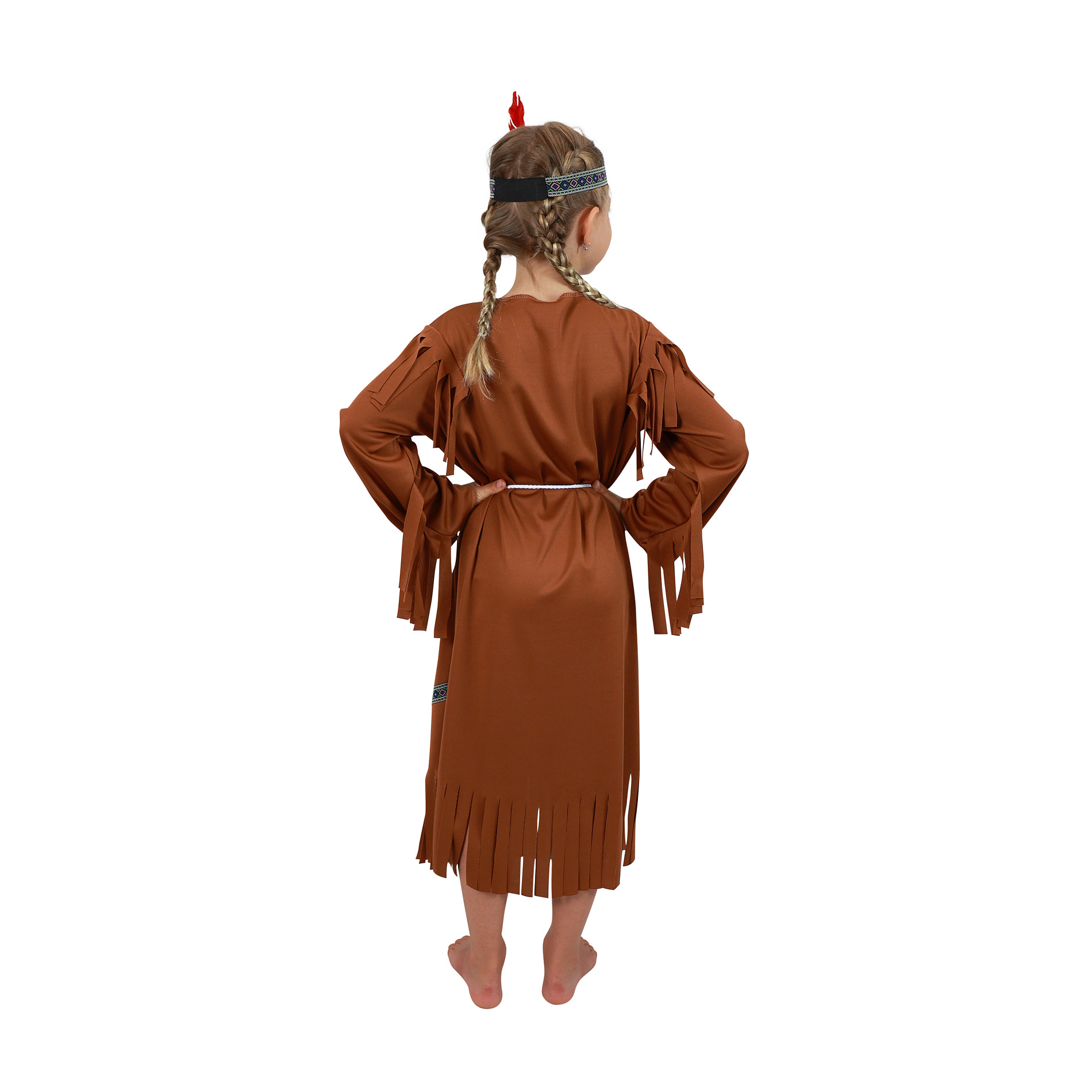 Stylový karnevalový kostým v motivu indiánské slečny! Kostým hnědé barvy ve velikosti S je určen pro děvčata ve věkovém rozmezí 4-6 let (105-116 cm). Balení obsahuje šaty s indiánskými vzory, šňůrku sloužící jako opasek a perfektně sladěnou čelenku. Celé šaty jsou navíc zdobeny střapci. Sekera není součástí balení.