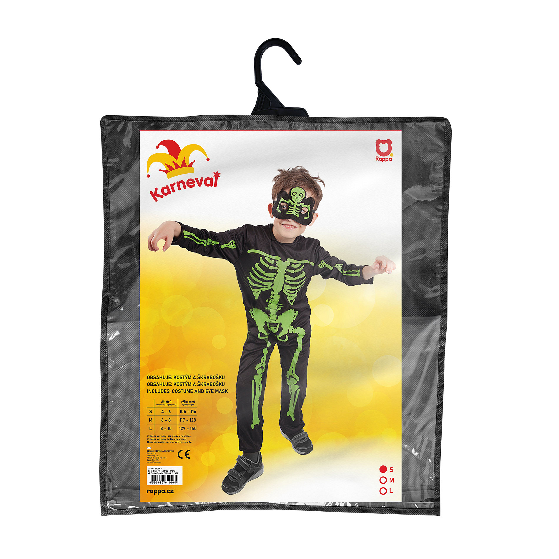 Strašidelný karnevalový kostým s motivem kostlivce! Kostým ve velikosti S je určen pro chlapečky ve věkovém rozmezí 4-6 let. Balení obsahuje černou kombinézu a masku s motivem zeleného kostlivce.