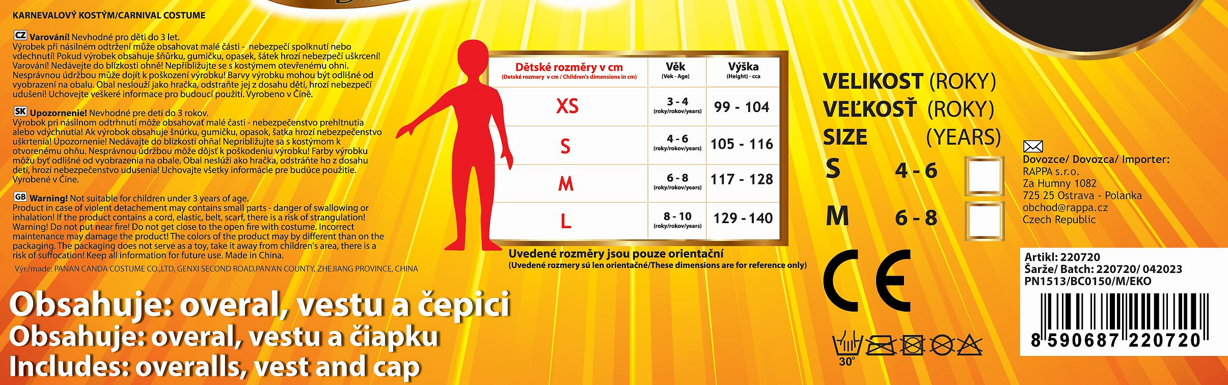 Obleč si kostým a záchranná akce může začít! Kostým policisty obsahuje černý overal, zásahovou maskáčovou vestu s nápisem POLICIE a čepici. Kostým ve velikosti M je určen pro děti ve věkovém rozmezí 6-8 let (117-128 cm). Nejen letos je potřeba myslet EKO-nomicky i EKO-logicky! EKO-balení je vhodné zejména pro e-shopy kde zákazník nakupuje dle fotografie a není třeba velkého balení s věšákem. EKO-logicky – na balení bylo použito méně plastu a dalších materiálů. Jedná se o malý transparentní obal s fotografií. EKO-nomicky –EKO-obal zabere jen polovinu místa – šetřete skladová místa s námi!