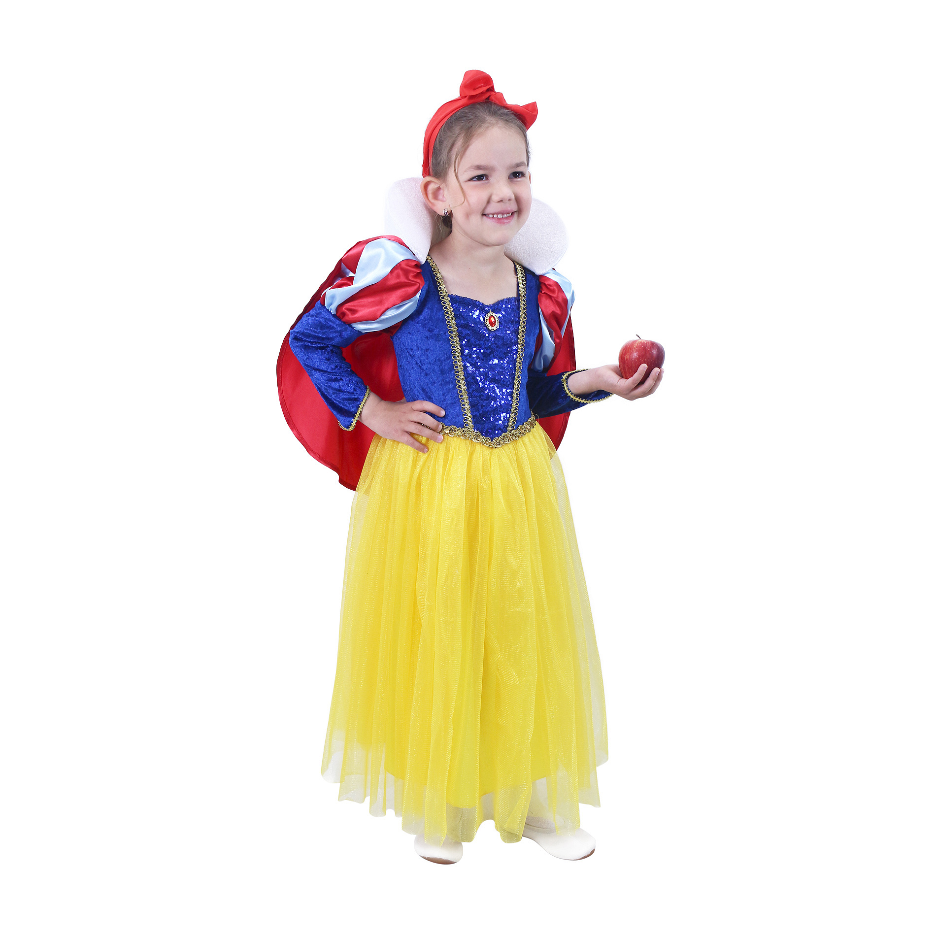 Proměň se během chvilky v půvabnou Sněhurku! Kostýmek o velikosti M je určen pro holčičky ve věkovém rozmezí 6-8 let (117-128 cm). Barevný kostým je dekorován v přední části modrými flitry a zlatým zdobením. Součástí je odnímatelný červený plášť s bílým límcem. Neobsahuje mašli do vlasů.