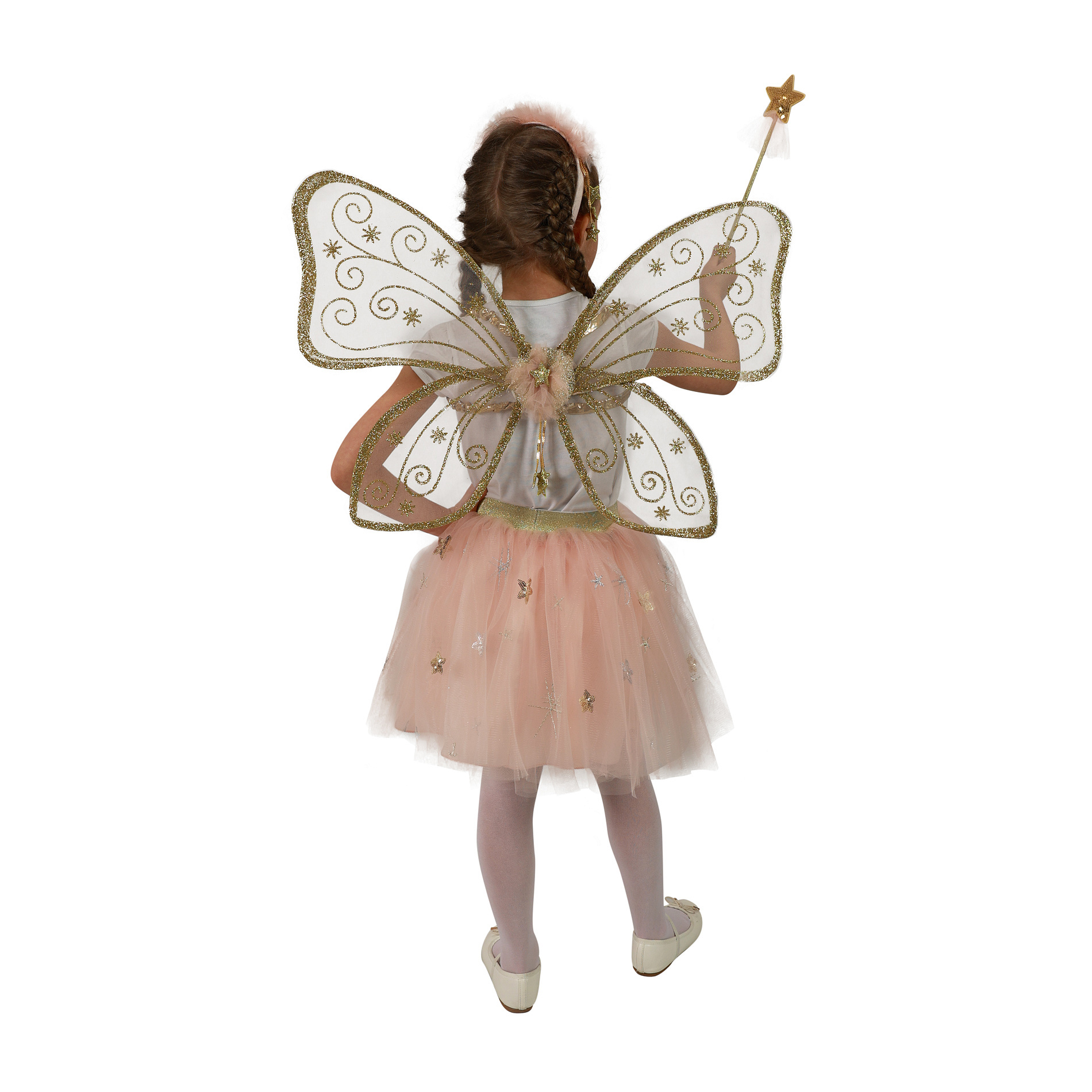 Krásná vílí sada pro malé holčičky! Sada obsahuje křídla se zlatým potiskem, nadýchanou sukýnku s tylem, který je zdobený stříbrnými a zlatými hvězdičkami. Celý set doplňuje vílí kouzelnická hůlka a čelenka do vlasů. Sukně je v pase na gumu a dlouhá cca 34 cm. Nejen letos je potřeba myslet EKO-nomicky i EKO-logicky! EKO-balení je vhodné zejména pro e-shopy kde zákazník nakupuje dle fotografie a není třeba velkého balení s věšákem. EKO-logicky – na balení bylo použito méně plastu a dalších materiálů. Jedná se o malý transparentní obal s fotografií. EKO-nomicky –EKO-obal zabere jen polovinu místa – šetřete skladová místa s námi!
