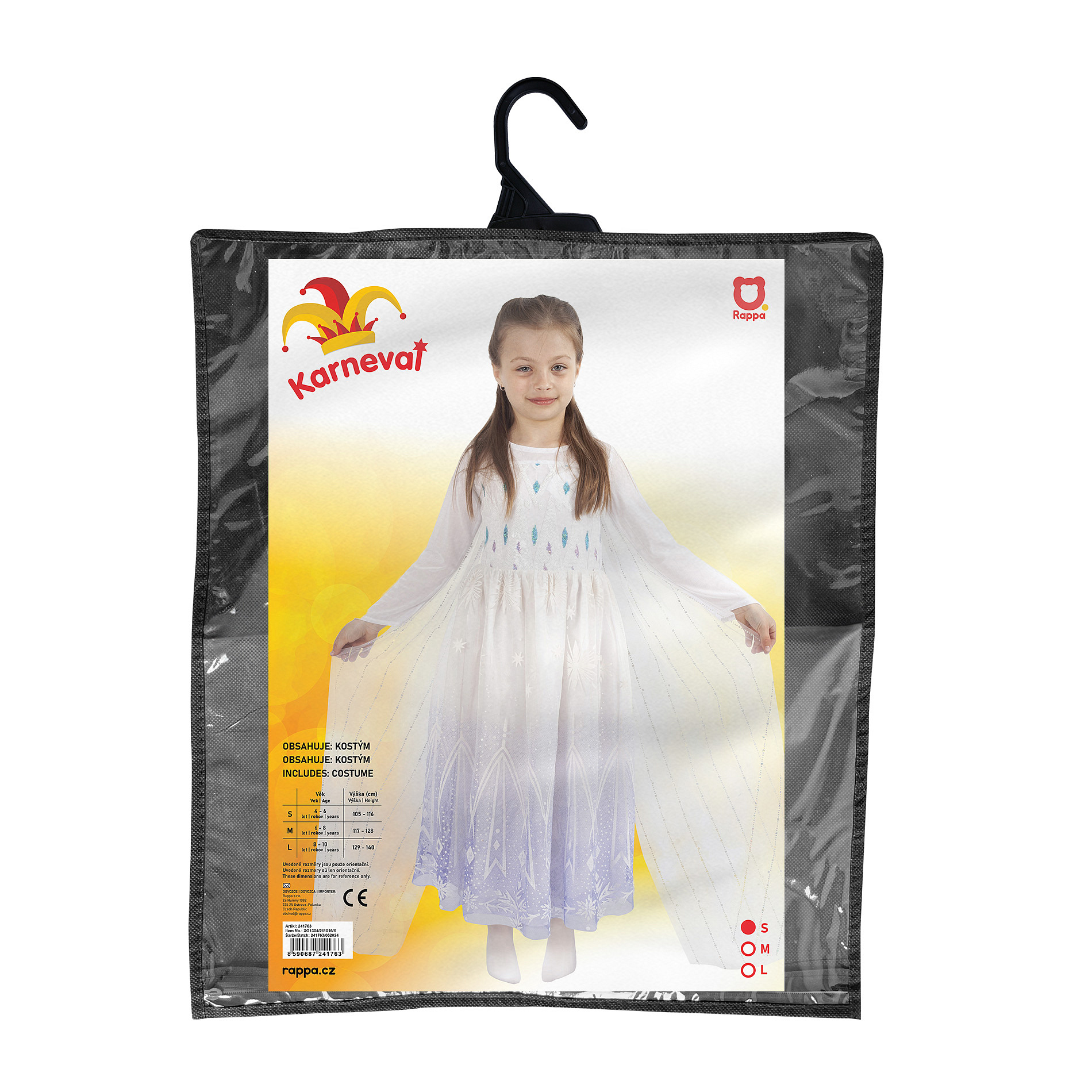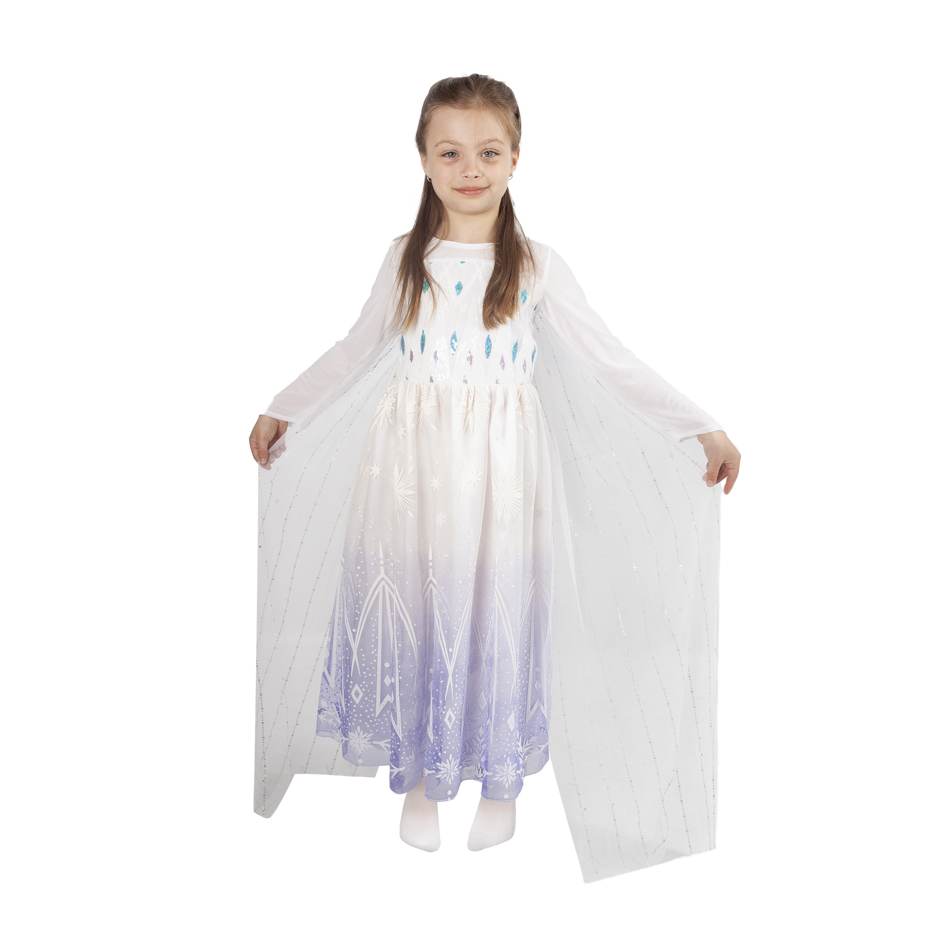 Úchvatný dívčí kostým pro všechny zimní princezny! Dlouhé šaty v bílé barvě jsou v horní části zdobené flitry, od pasu dolů je bílo-fialová tylová sukně zdobena potiskem. Součástí šatů je také vlečka dekorována flitry. Kostým ve velikosti S je určen pro holčičky ve věkovém rozmezí 4-6 let (105-116 cm).