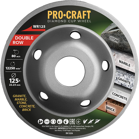Diamantový brusný kotouč (hrncový) Procraft WR125 Double Row, 22.23: Maximální otáčky: 12250 ot./min Průměr kotouče: 125 mm Maximální pracovní rychlost: 80 m/s na mokré a suché řezaní, vhodná pro kámen, mramor, žula, beton, cihla