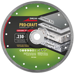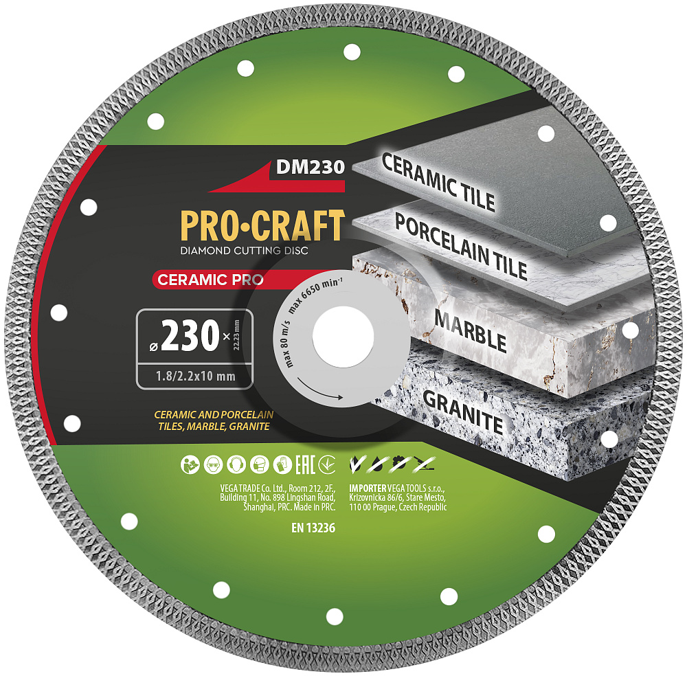 Diamantový řezný kotouč Ceramic PRO Procraft DM230, 22.23: Maximální otáčky: 6650 ot./min Průměr kotouče: 230 mm Tloušťka: 1.8 mm Maximální pracovní rychlost: 80 m/s na mokré řezání, vhodný pro žula, keramická dlažba, mramor, obklad