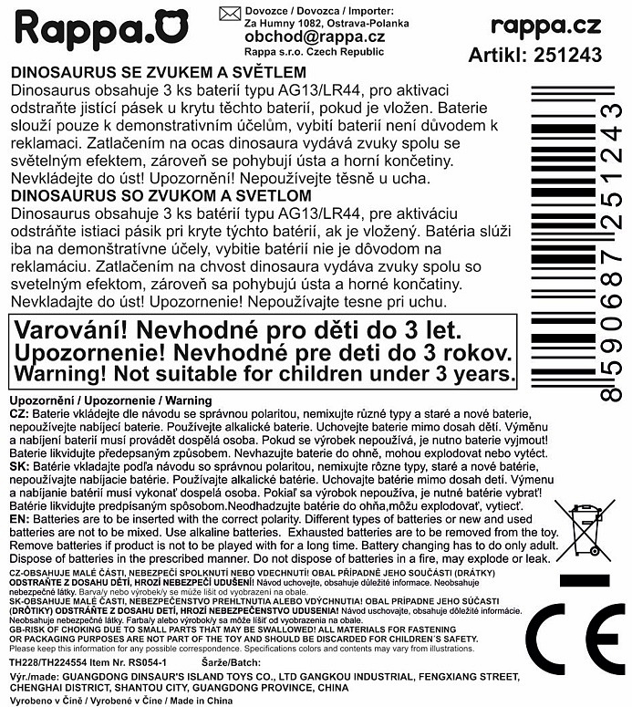 Zažij prehistorické dobrodružství s tímto T-Rexem! Dinosaurus je vybaven zvukovým a světelným efektem – při zatlačení na ocas vydává hrozivý řev a současně se rozsvítí světlo, které umocní dramatický efekt. Při stisknutí hlavy se Velociraptorovi otevřou ústa a pohybují se jeho přední končetiny, což dává hře ještě dynamičtější rozměr. Díky pohyblivým částem si děti užijí hodiny zábavy při objevování světa dinosaurů. Pro světelný a zvukový efekt je potřeba 3 ks baterií typu AG13, které jsou uvnitř výrobku.