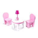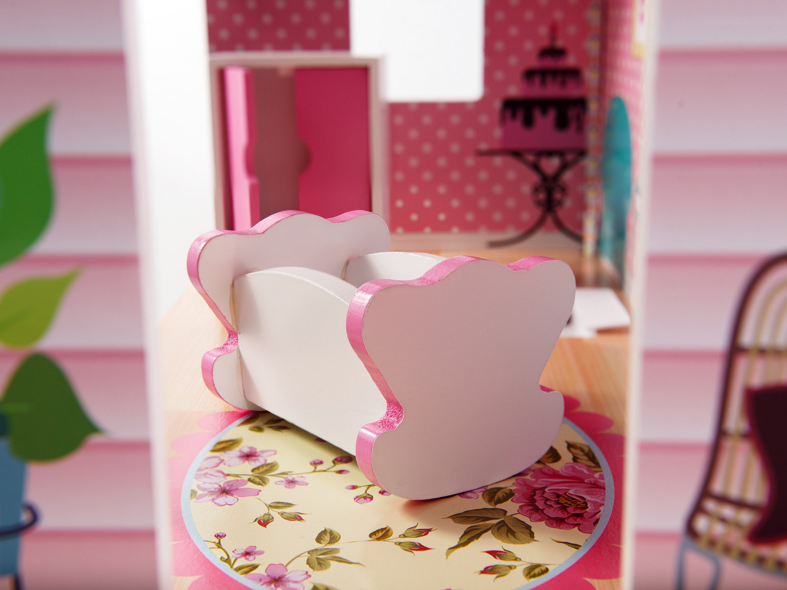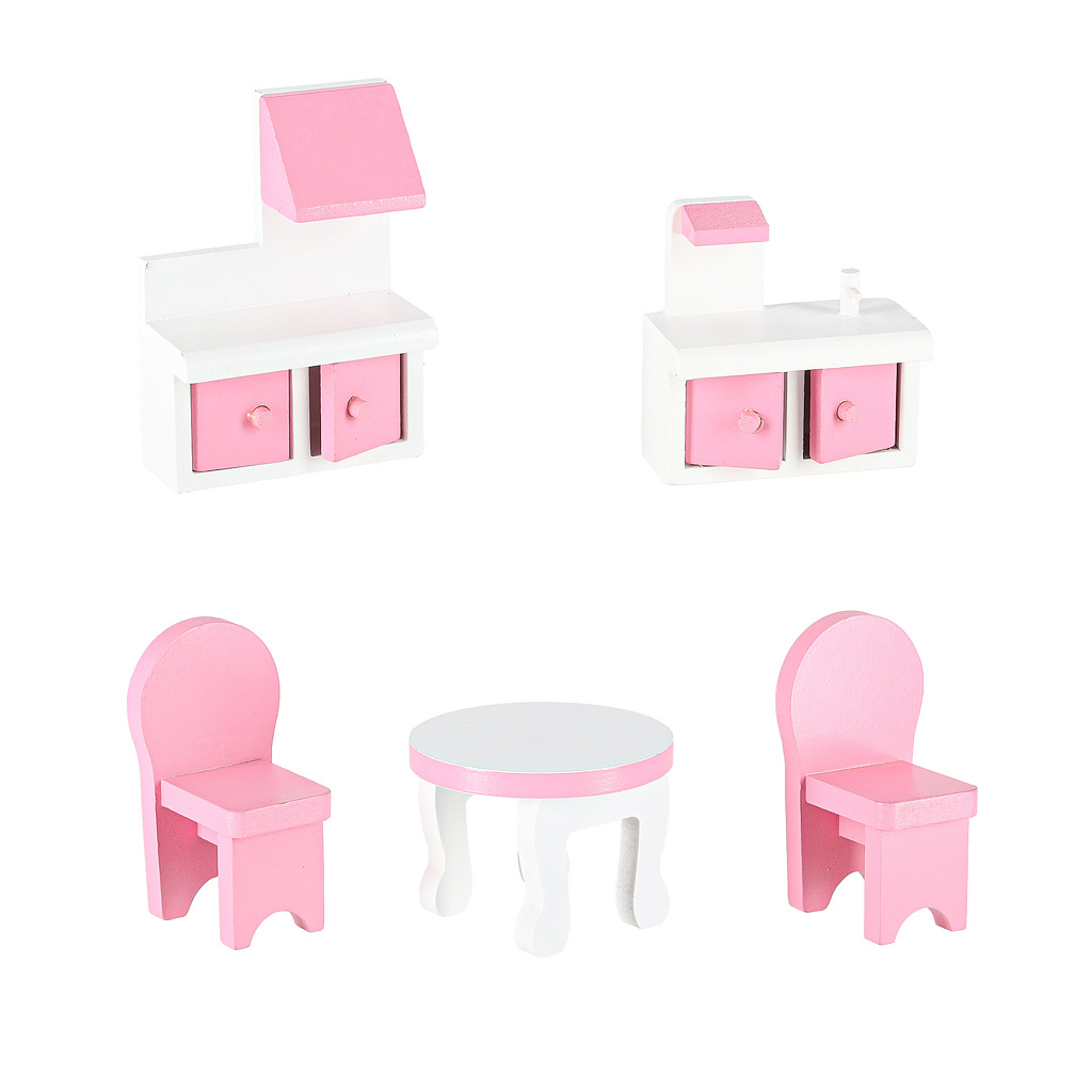 Do zestawu dołączone zostały piękne mebelki. Akcesoria wykonano z drewna. Przykładowo w pomieszczeniu pełniącym funkcję kuchni można znaleźć urocze mebelki z otwieranymi drzwiczkami. Zawarte w zestawie akcesoria będą stanowiły doskonałe uzupełnienie każdego pomieszczenia i przydadzą się podczas wspólnej zabawy.