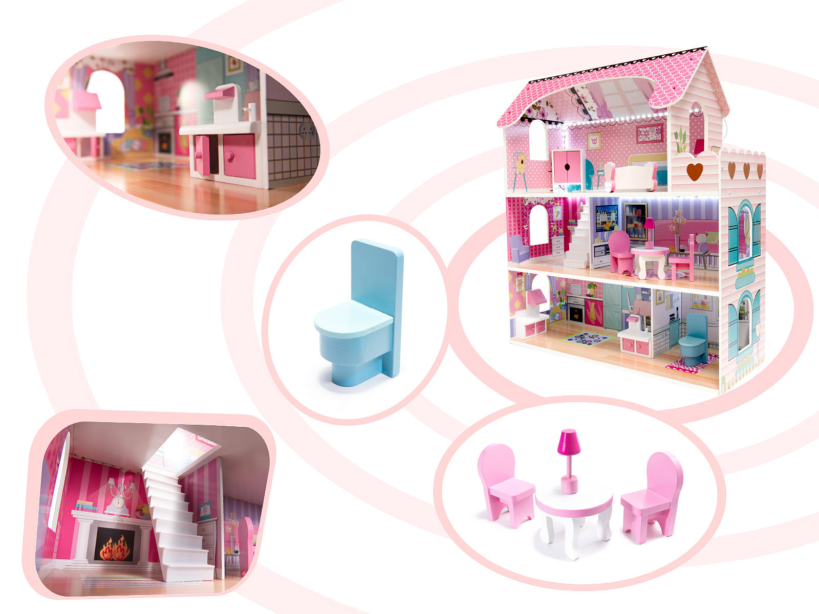 Miniaturki mebli, grafiki na ścianach i oświetlenie LED sprawiają, ze nasze domki dla lalek są wyjątkowe i bardzo przytulne.