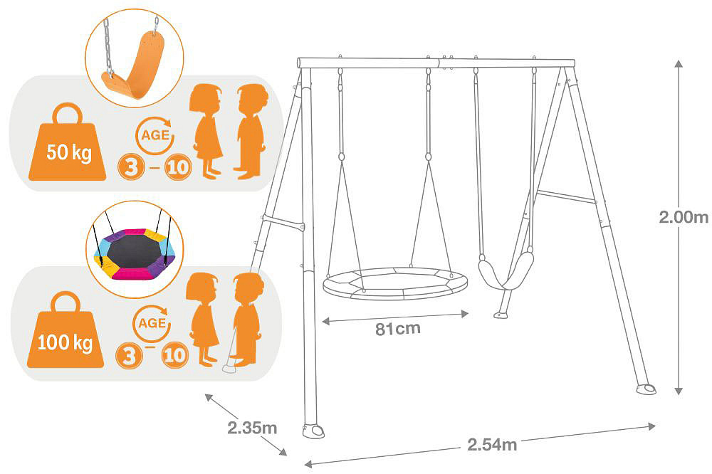 The sturdy frame made of metal tubes with a diameter of 0.60 mm and thickness of 0.09 mm ensures reliable stability and long-lasting durability – even with daily use in the garden. Additional ground anchor stakes keep it securely in place, guaranteeing maximum safety during play. A solution that gives peace of mind to parents and more joy to kids.