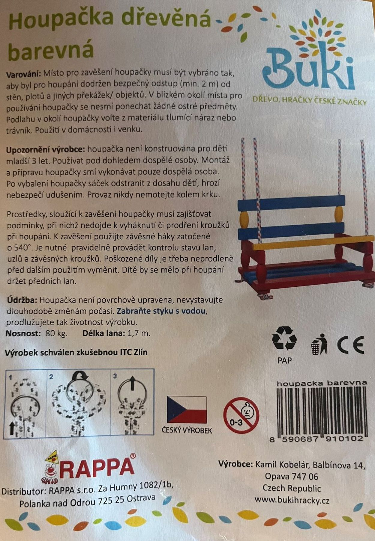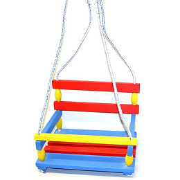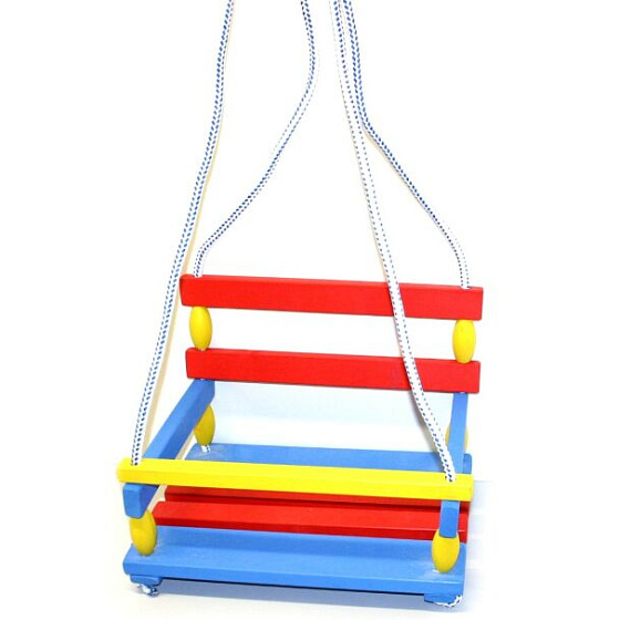 Klasická barevná houpačka ze dřeva se zábranou proti vypadnutí. Nosnost 80kg