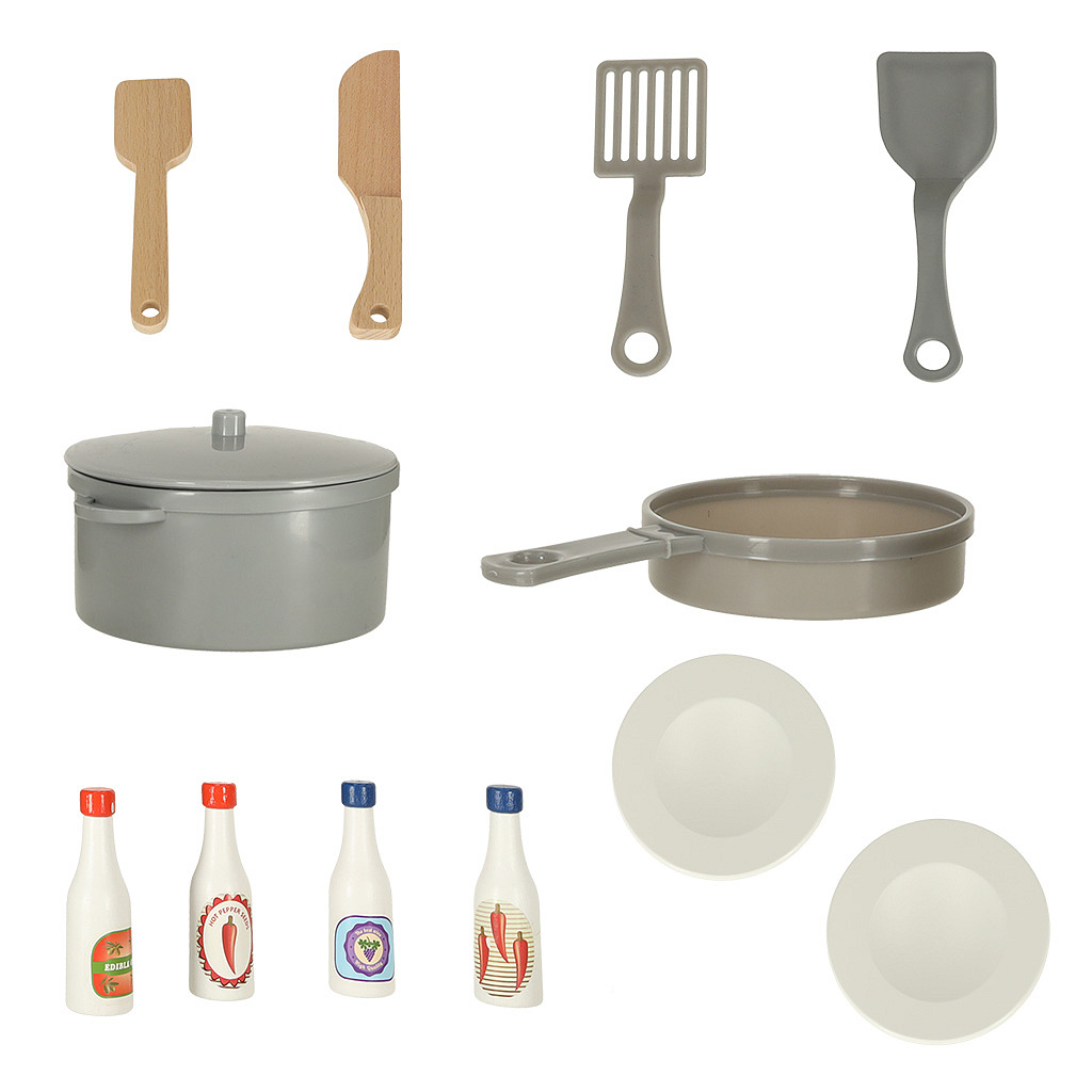 Żadna kuchnia nie obejdzie się bez dodatkowych akcesoriów ułatwiających gotowanie, dlatego do tej kuchni również dołączono liczne gadżety, dzięki którym maluch poczuje się jak w prawdziwy szef kuchni! W zestawie między innymi plastikowa patelnia i garnek z pokrywką, plastikowe szpatułki do gotowania, drewniane sztućce oraz dwa talerzyki.