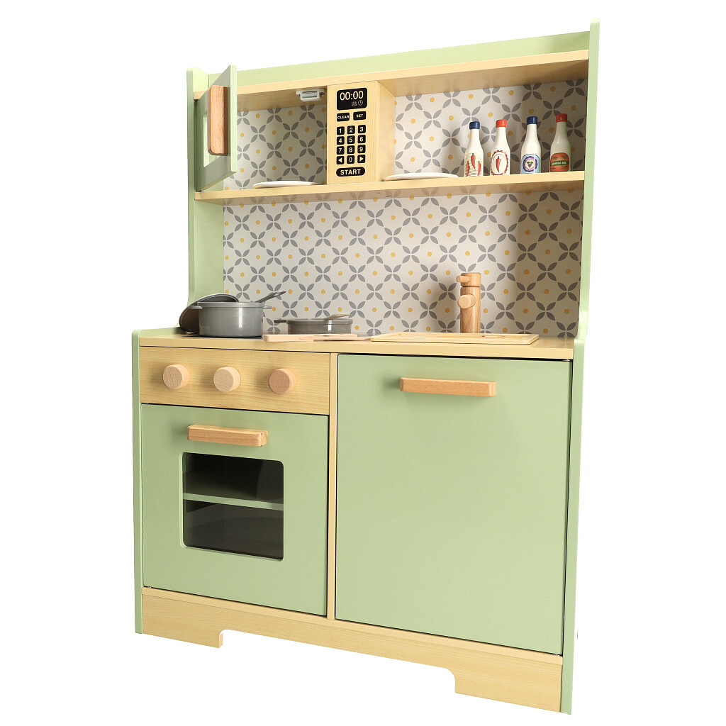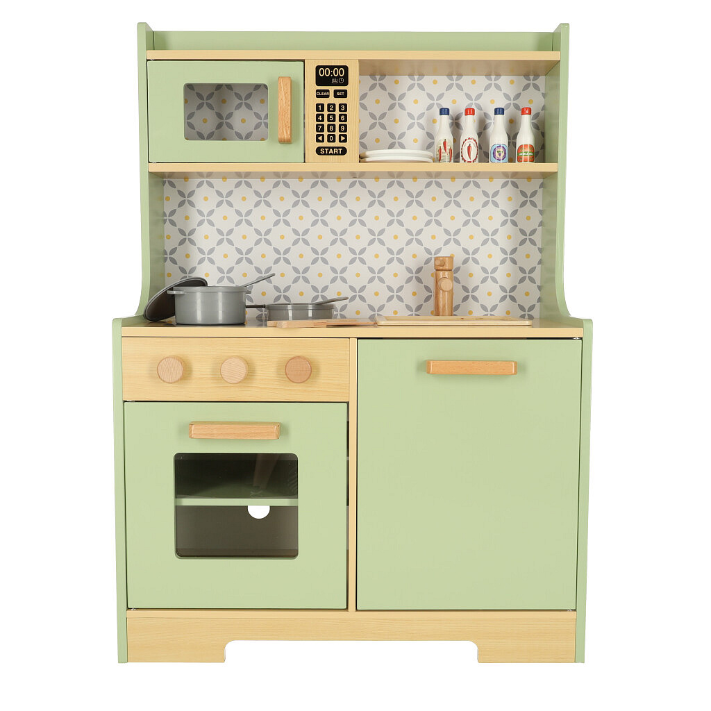 Drewniana kuchnia dla dzieci w miętowym kolorze to własne miejsce malucha, w którym może odkrywać tajniki sztuki gotowania i uczyć się nowych umiejętności!