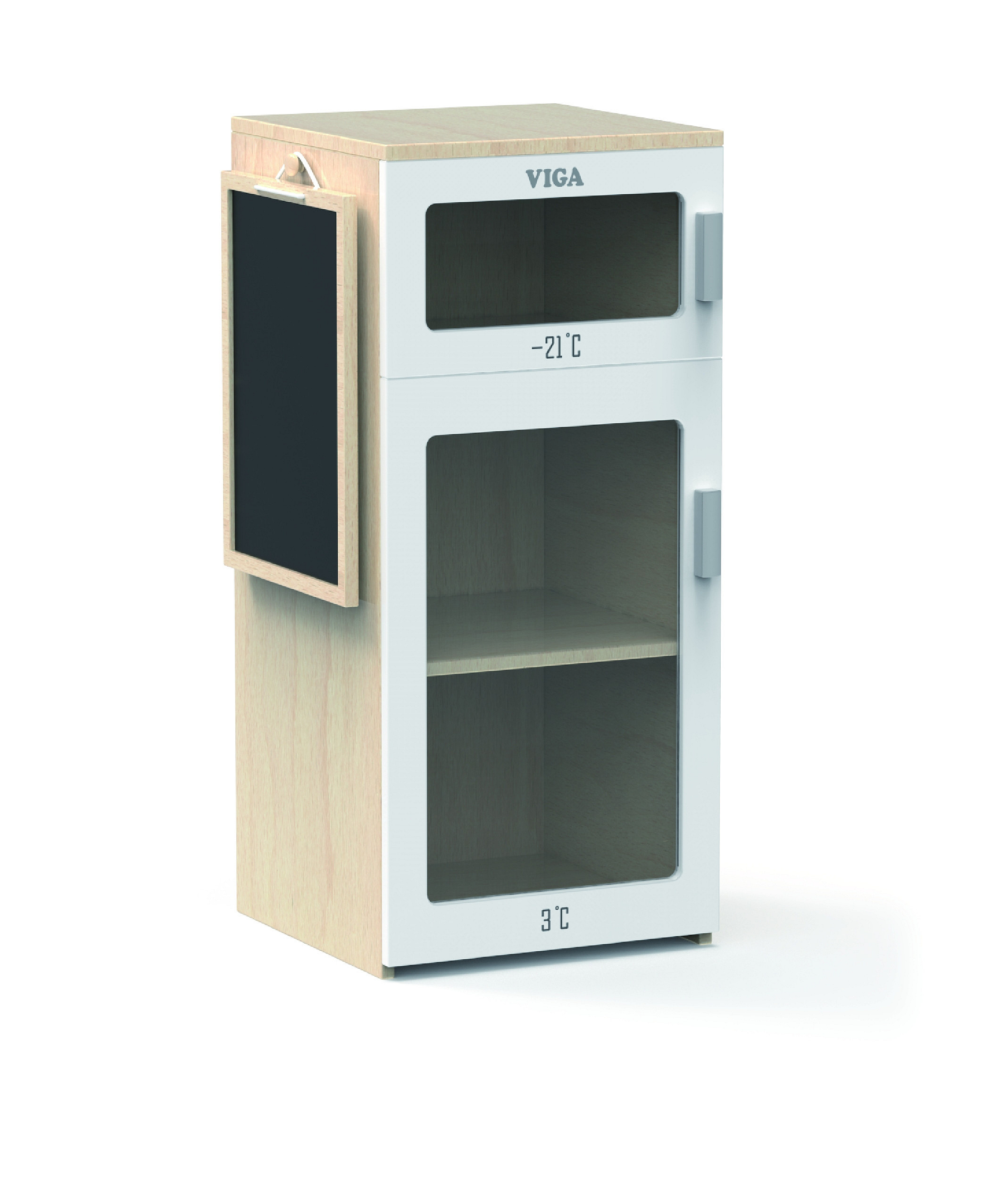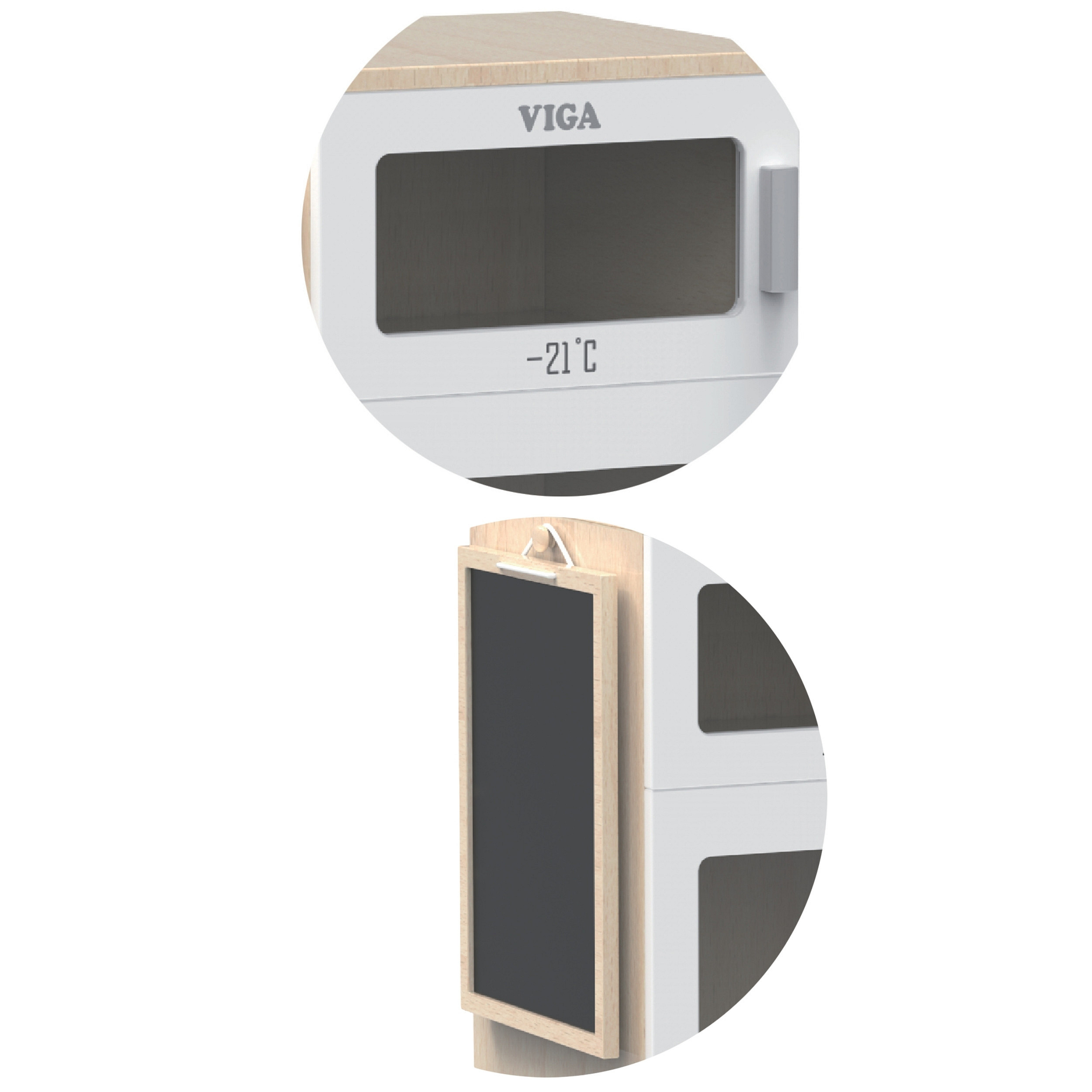 Uzupełnij kącik zabaw swojego dziecka o uroczą drewnianą lodówkę Viga. Ta realistyczna zabawka to świetny sposób na rozwijanie wyobraźni i kreatywności podczas zabawy w dom. Lodówka posiada dwie komory - zamrażarkę i chłodziarkę, dzięki czemu dziecko może wyobrażać sobie, że przechowuje swoje produkty w odpowiednich temperaturach. Dodatkowo, na drzwiach lodówki znajduje się tablica kredowa, na której maluch może zapisywać listę zakupów lub rysować.