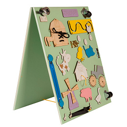 Jednak poza kolorowymi zwierzętami, na drewnianej planszy znajduje się szereg ruchomych elementów, który pozwoli na popracowanie nad małą motorykę i zdolnościami manualnymi – sznurówki do nauki wiązania, zamek błyskawiczny, dzwonek rowerowy i wiele innych!