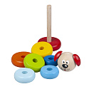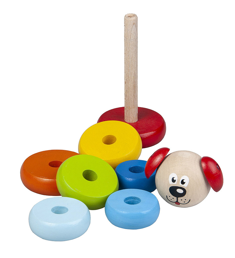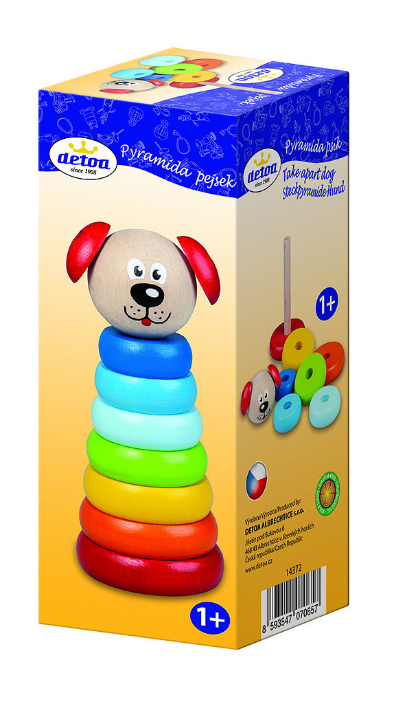 Poskládejte pyramidu z dřevěných kroužků a na vrcholek nasaďte hlavičku pejska, 8 ks. Rozměr krabice
