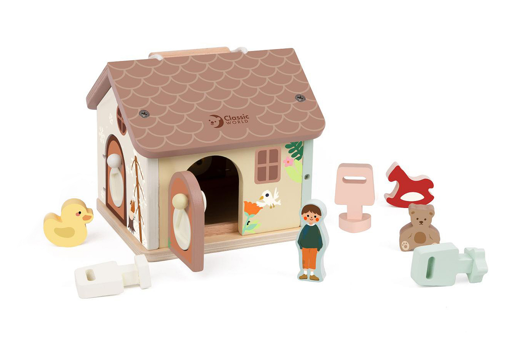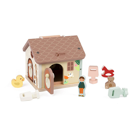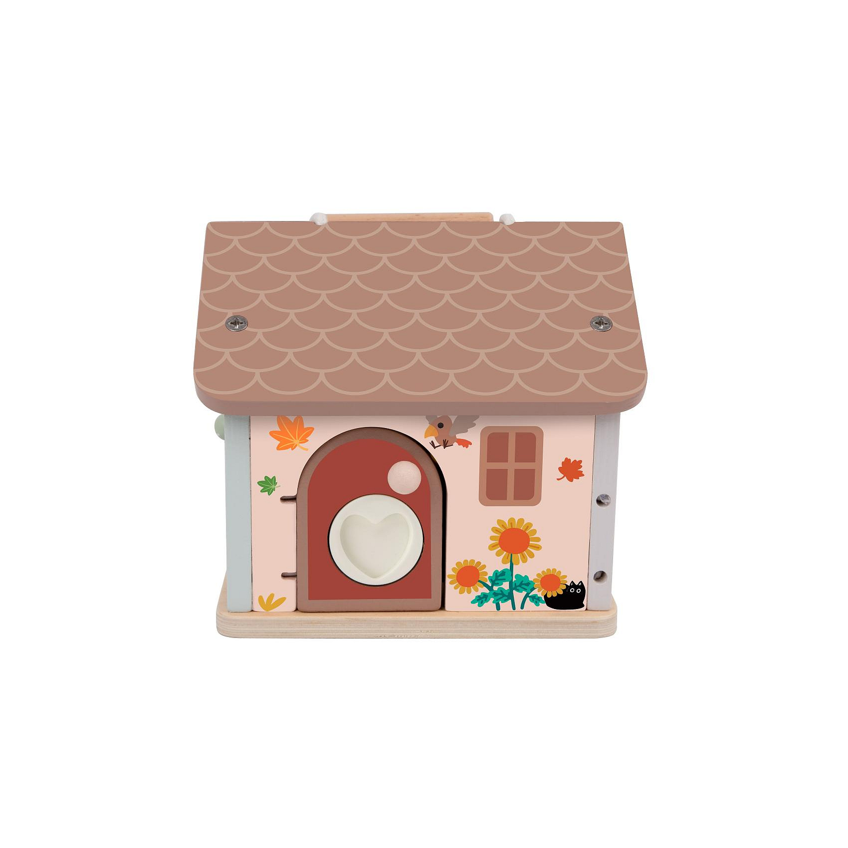 Objevuj svět uvnitř malebného dřevěného domečku! Tato krásná vkládačka nabízí dětem 11 dílků k prozkoumání a vkládání – postavičky, zvířátka i drobnosti z domácnosti. Děti si rozvíjejí jemnou motoriku, učí se koordinaci ruky a oka a trénují trpělivost při vkládání jednotlivých prvků na správné místo. Díky praktickému držadlu na střeše si domeček mohou snadno přenášet. Jemné barvy a ilustrace podněcují fantazii a radost z hry. Velikost hračky: cca 16 × 15 × 14 cm Vhodné pro děti od 18 měsíců