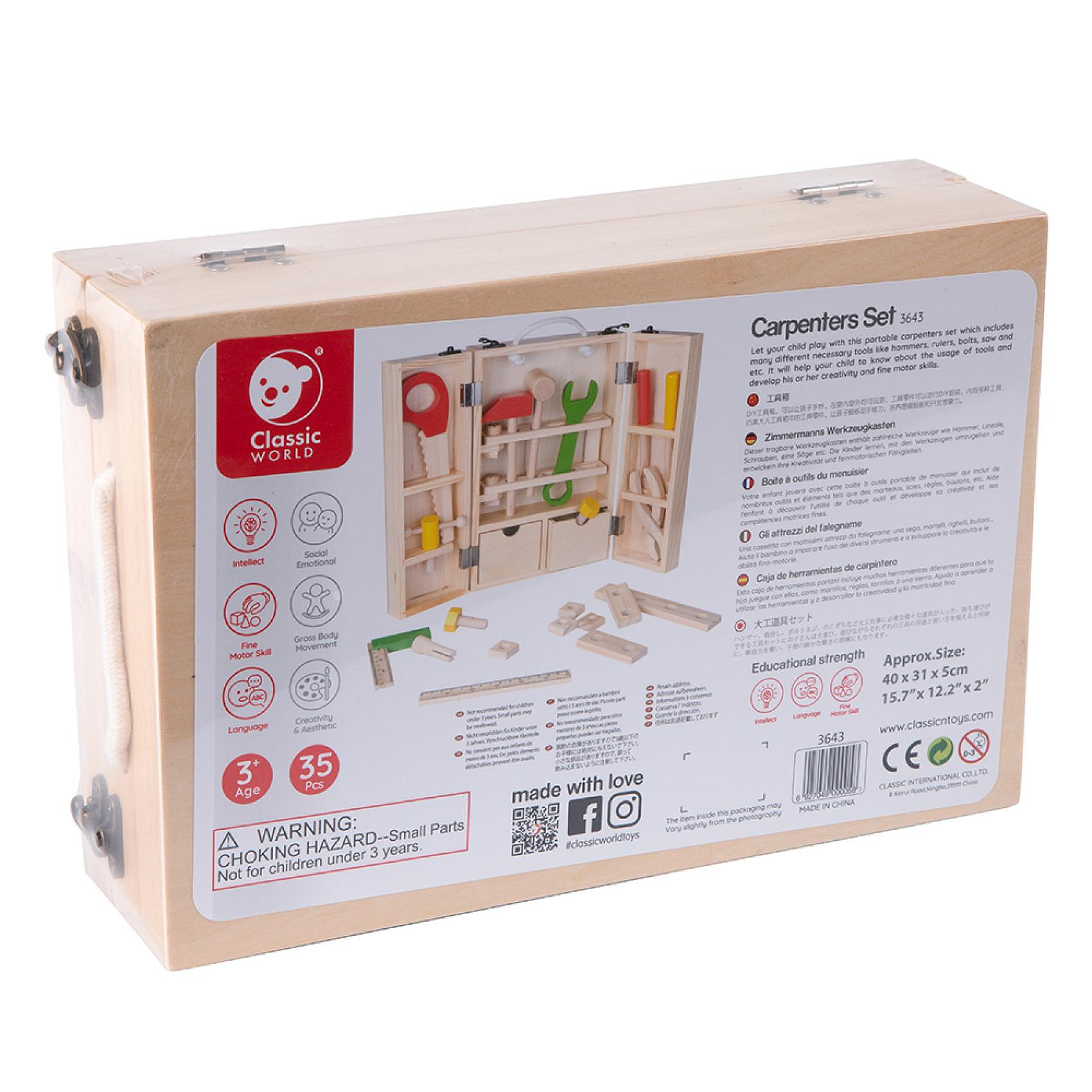 " V sadě dřevěného nářadí se nachází:- sada šroubků, matky, hmoždinky, lišty s otvory k montáži, 2 klíče, šroubováky, kladívka, pravítka a pilka. Dítě může libovolně přikrucovat lišty s pomocí klíče a šroubováku. Všechny díly může spolu spojovat pomocí šroubků. Dětské barevné nářadí je vyrobeno z vysoce kvalitního a bezpečného materiálu. . "
