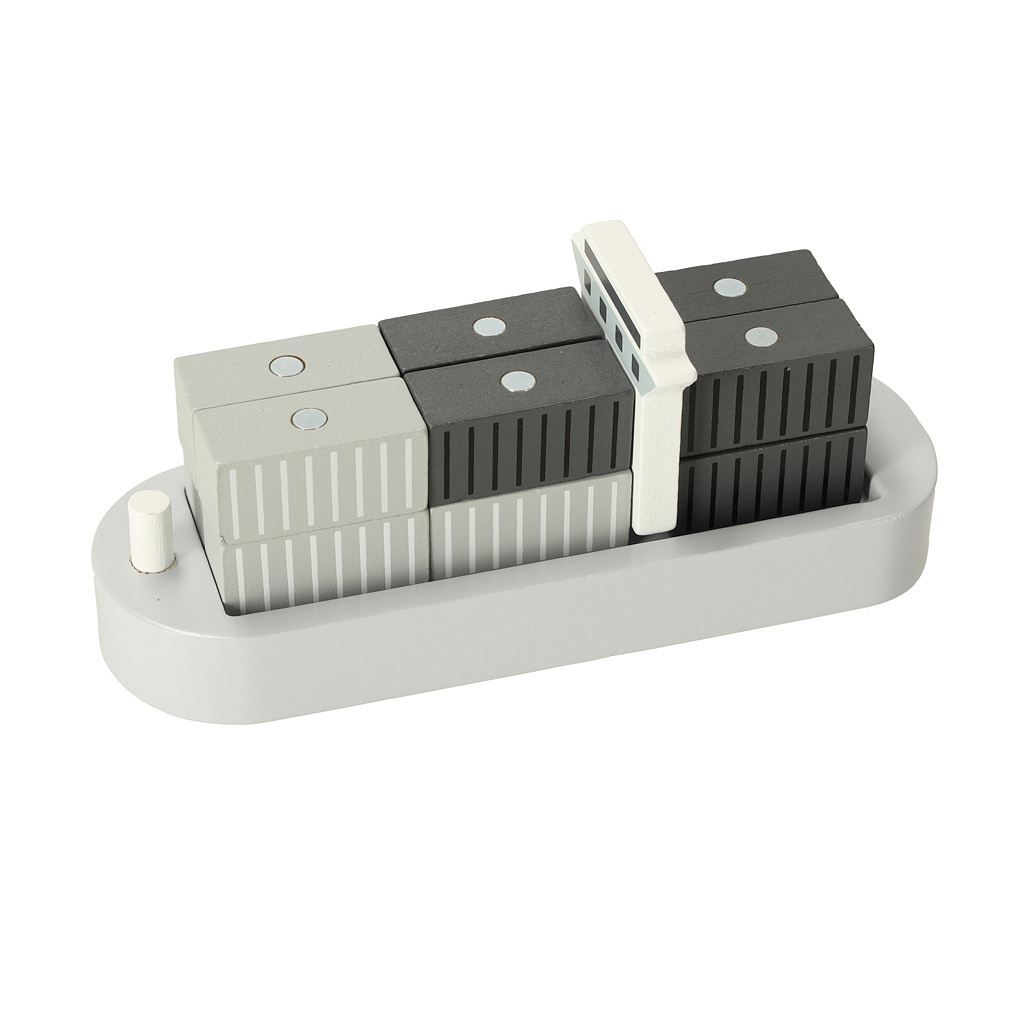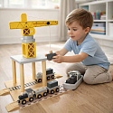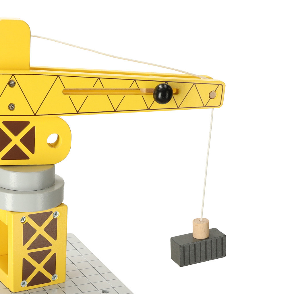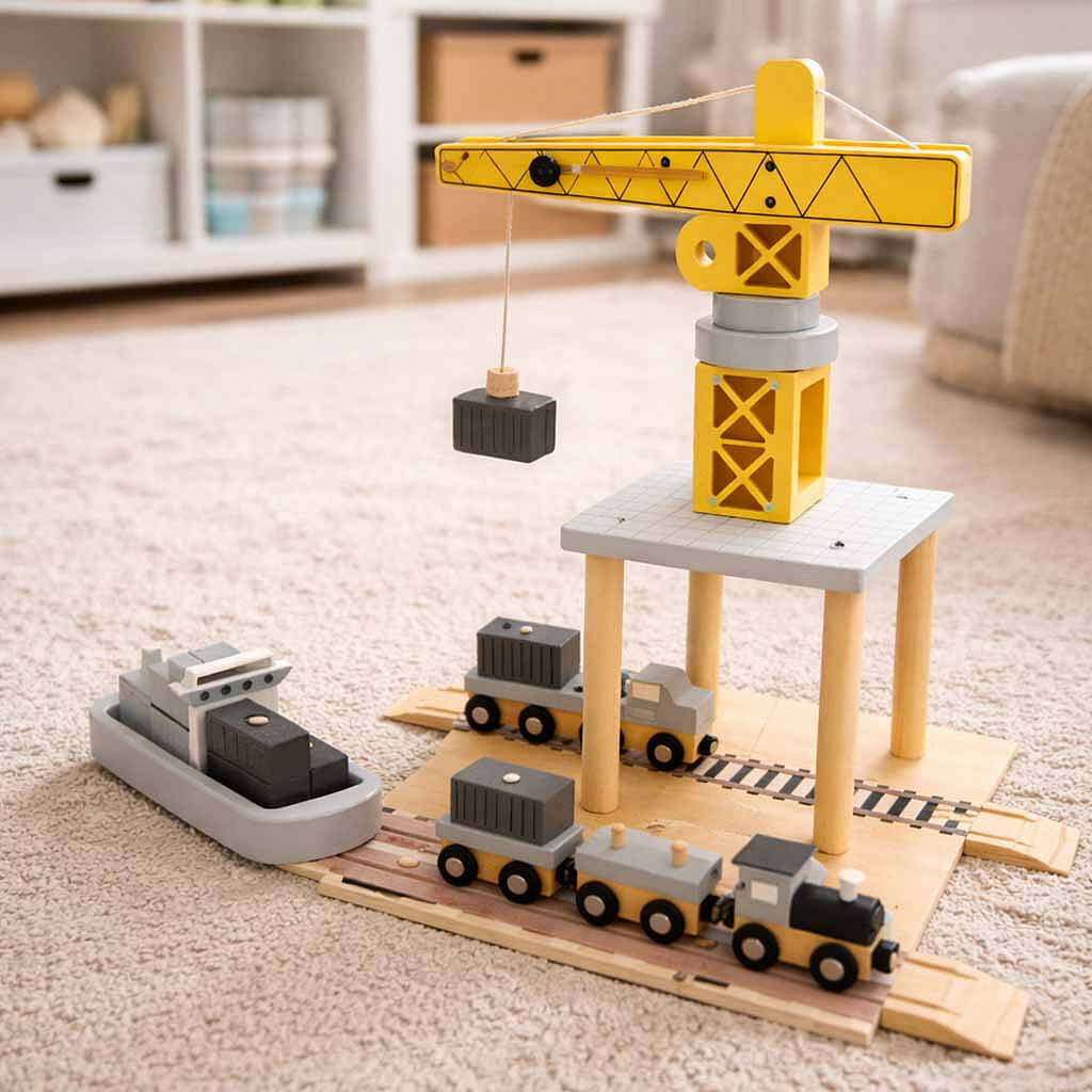 Drewniany port morski z dźwigiem to wspaniała zabawka dla małych miłośników transportu i budownictwa. Zestaw składa się z żółtego żurawia portowego, którym można obracać i podnosić kontenery ze statku na pojazdy transportowe – ciężarówkę i pociąg z dwoma wagonami. Różnorodne elementy pozwalają dziecku na odgrywanie scenek niczym z prawdziwego portu, rozwijając swoją kreatywność, zdolności manualne oraz koordynację ruchową.