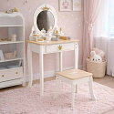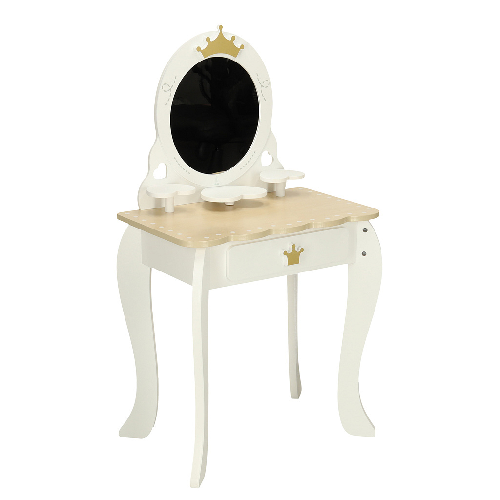 Toaletka posiada wszystkie udogodnienia prawdziwego mebelka – duże, okrągłe lusterko oraz półki i szufladę na kosmetyczne akcesoria. Oraz praktyczny taboret, który ułatwi wykonywanie „makijaży” w wygodnej pozycji.