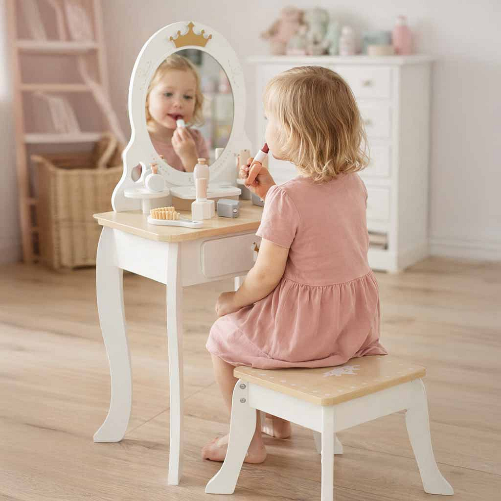jakość wykonania na najwyższym poziomie – do stworzenia toaletki wykorzystano trwałe i solidne drewno, dzięki czemu zabawka dostarczy dziecku radości przez lata