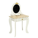Toaletka wraz z akcesoriami jest wykonana w całości z drewna, którego zostało wyszlifowane na gładko i pomalowane nietoksycznymi farbami. Biało-złota kolorystyka sprawia, że zestaw jest minimalistyczny i doskonale sprawi się jako ozdoba pokoju dziecka.