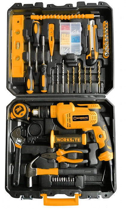 Máte málo místa pro vlastní dílnu? Tahle sada WORKSITE nabízí skvělé řešení. V jednom balení nejdete v podstatě kompletní vybavení domácí hobby dílny. Výkonnou příklepovou vrtačku EID448 vhodnou pro vrtání do různých materiálů včetně zdiva a pórobetonu doplňuje sada vrtáků, bitů a šroubováků či kleští nejrůznějších velikostí a provedení.