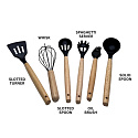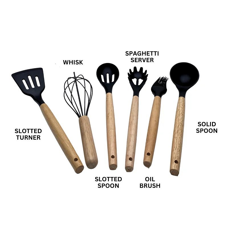 Designed with both style and practicality in mind, these utensils have an ergonomic soft-touch handle and a sleek wood design that provides a comfortable and secure grip. The silicone surface is gentle on cookware, preventing scratches and reducing clattering noise, making it ideal for non-stick pots and pans. This set includes all the essentials for everyday cooking: a Slotted Turner, Solid Spoon, Slotted Spoon, Spaghetti Server, Oil Brush, and Whisk, providing versatile tools for a variety of kitchen tasks.