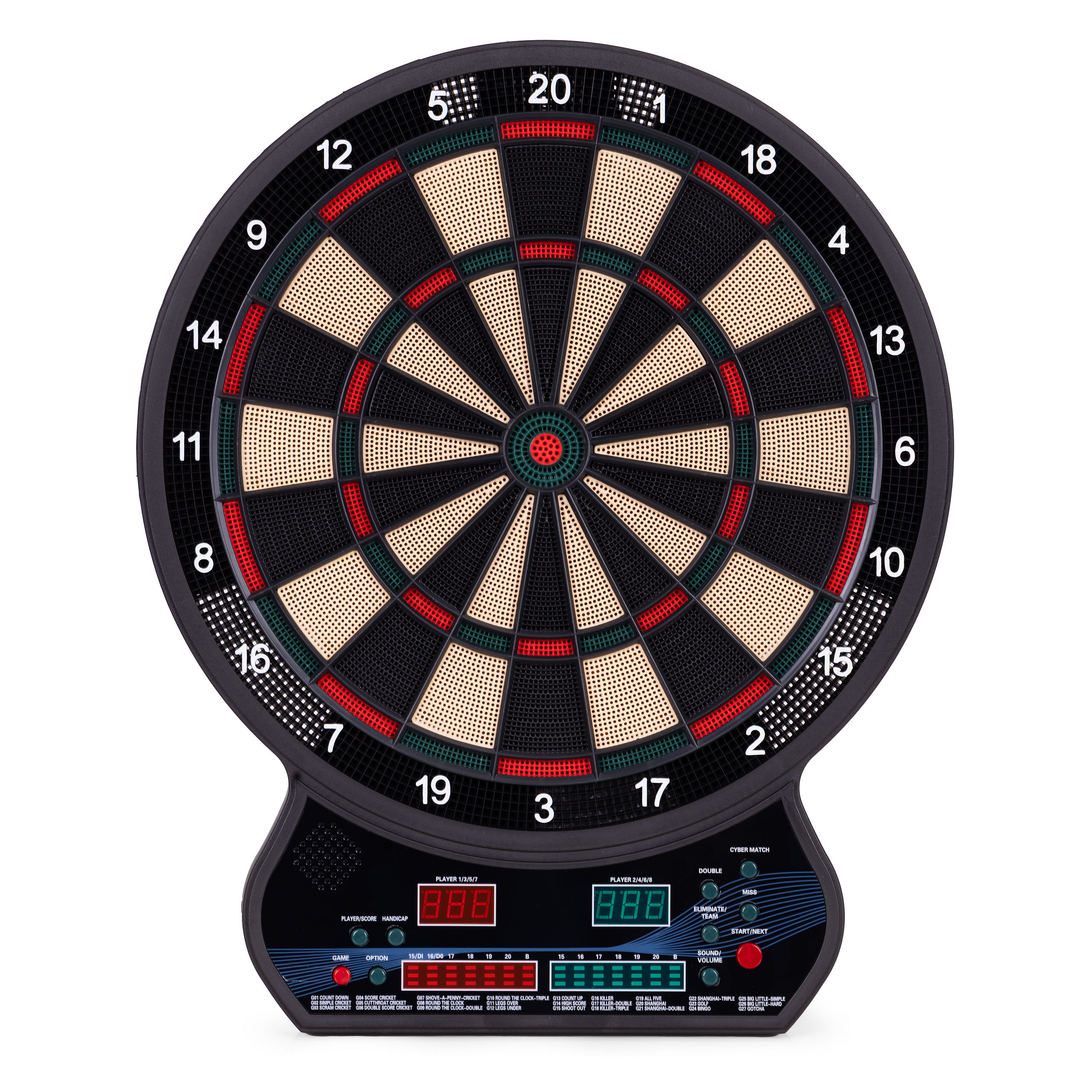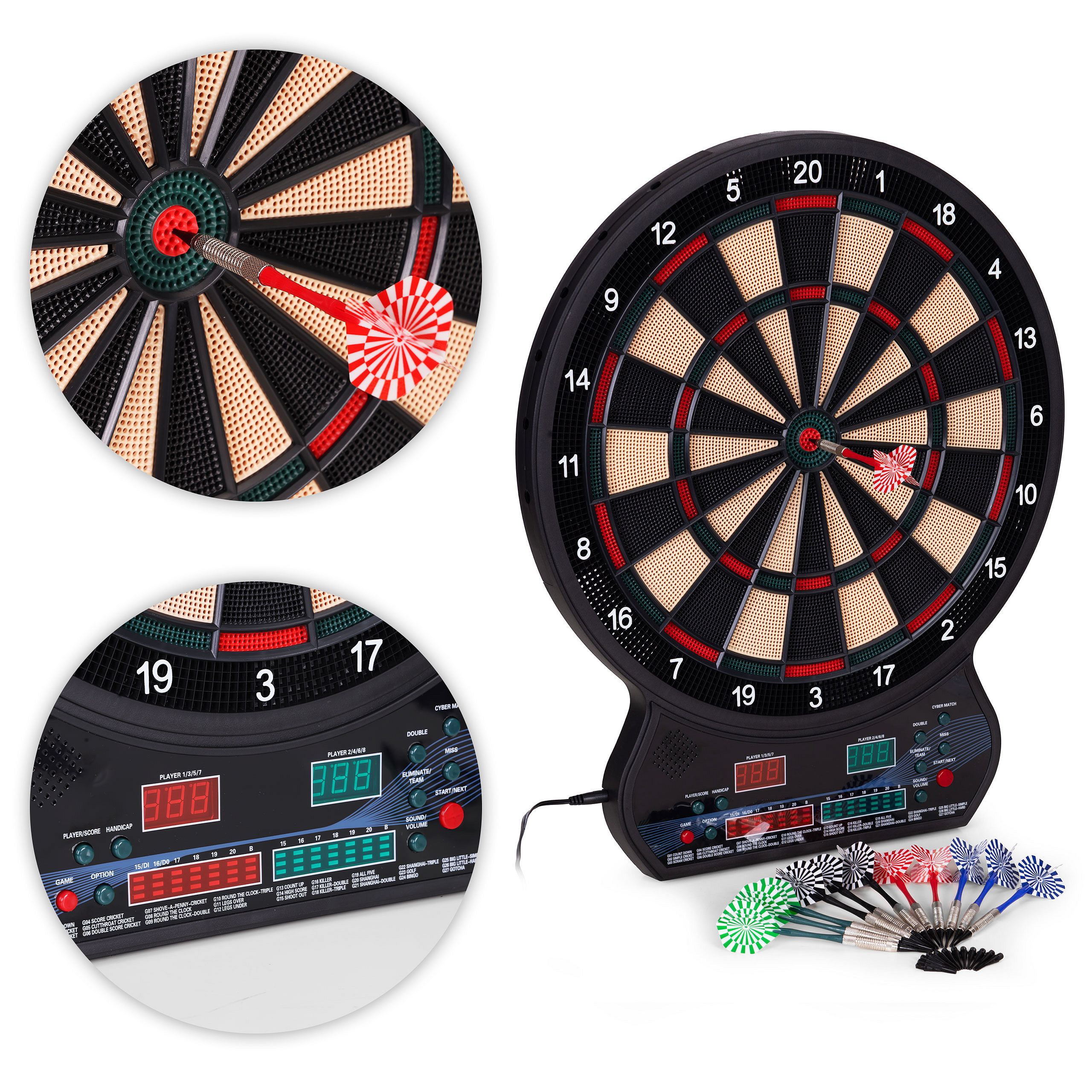 The intuitive control panel allows you to quickly choose from 27 games and 202 gameplay variations. You’ll find popular modes such as Count Down, Cricket, Gotcha, Round Clock, and Shanghai, as well as more advanced options, including Cybermatch (play against the computer) and Handicap (difficulty adjustment for each player individually). Thanks to the two LED displays showing scores and the active player, along with built-in voice prompts, every game runs smoothly and without unnecessary pauses. The set is complemented by a Polish instruction manual that explains the rules of each game step by step – just turn on the dartboard, select a mode, and start the excitement!