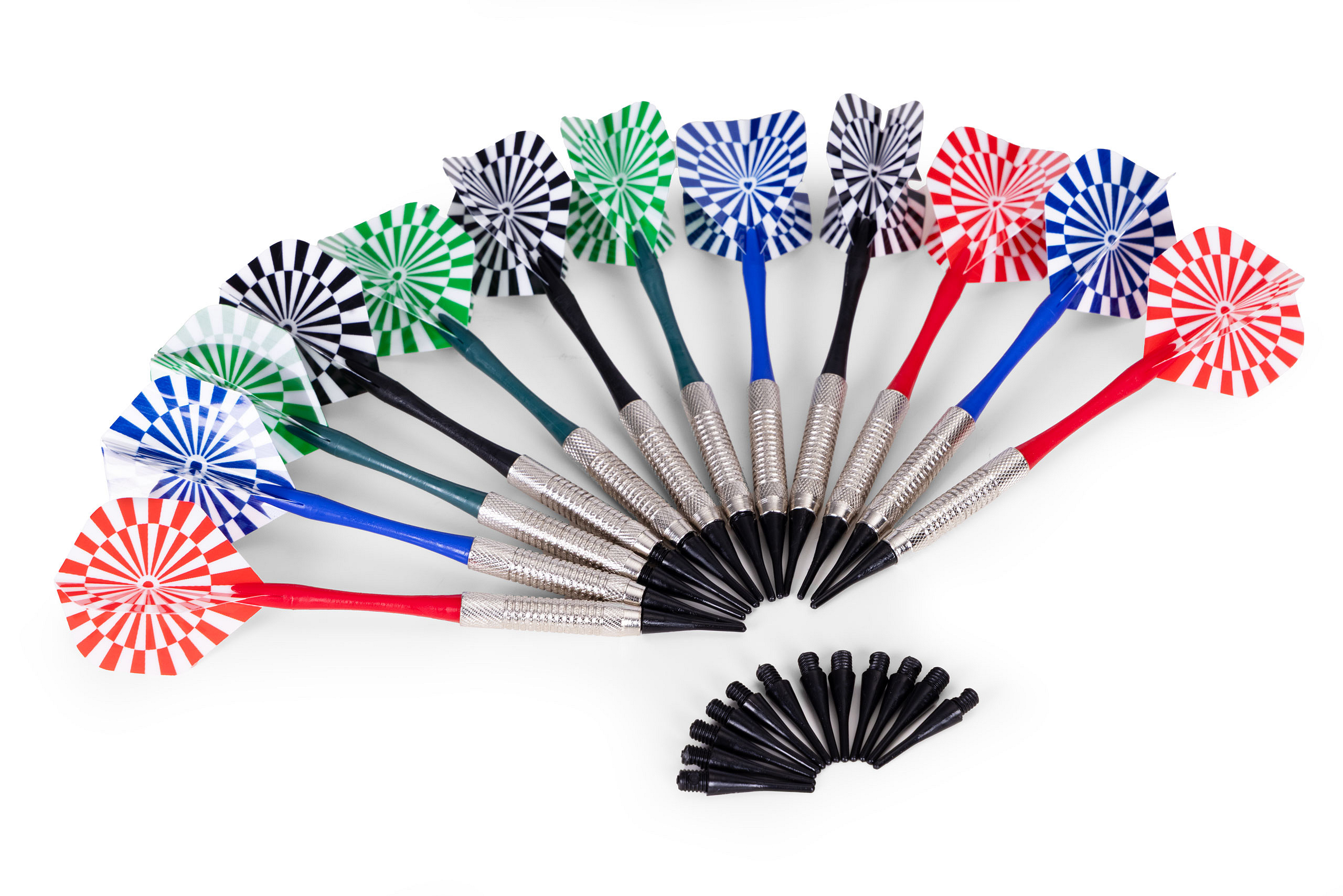 The set includes 12 darts with decorative flights in blue, black, red, and green, making it easy to distinguish players or teams during group competition. The darts feature solid craftsmanship and proper balance, ensuring a comfortable grip and allowing for precise, consistent throws. The set is completed by a set of 12 spare tips, guaranteeing long-lasting gameplay without interruptions.