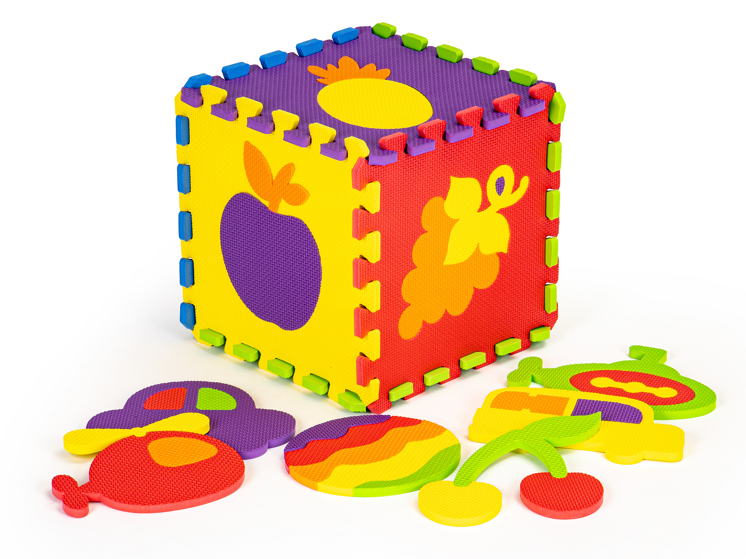 Since the mat connects like puzzles, it can be used to build towers, cubes, and other constructions that the child imagines. Each picture can be removed from the square, allowing children to play with matching and fitting them, while also learning the names of fruits and vehicles.