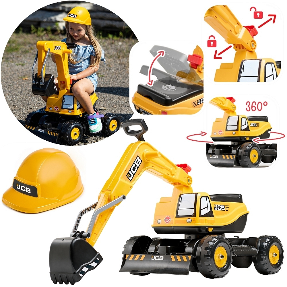 Jeździki FALK JCB do złudzenia przypominają autentyczne pojazdy i maszyny, wykonane z ogromną precyzją i troską, by każdy detal został wiernie odwzorowany - elementy można ze sobą łączyć, uzupełniać tworząc wspaniałą kolekcję, która z powodzeniem będzie cieszyć małych użytkowników! KOPARKA FALK JCB to bardzo solidna konstrukcja i wysokiej jakości trwałe materiały. Zabawka jest bardzo zwrotna, łatwa w obsłudze - doskonale sprawdzi się w ogrodzie czy na plaży. Pod siedzeniem mamy ukryty schowek dla twoich pociech na ich cenne rzeczy. Dodatkowo w zestawie z jeździkiem- koparką mamy w zestawie żółty kask.