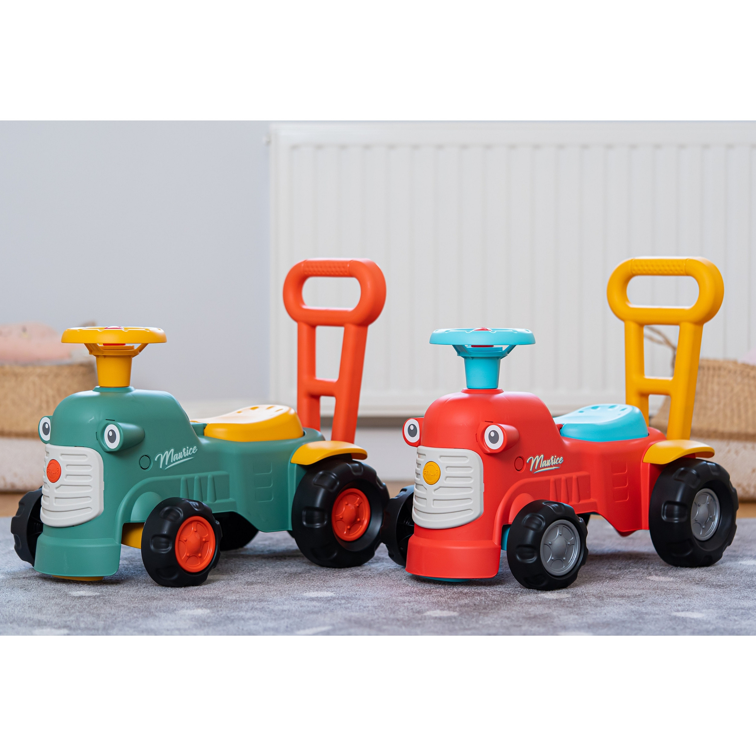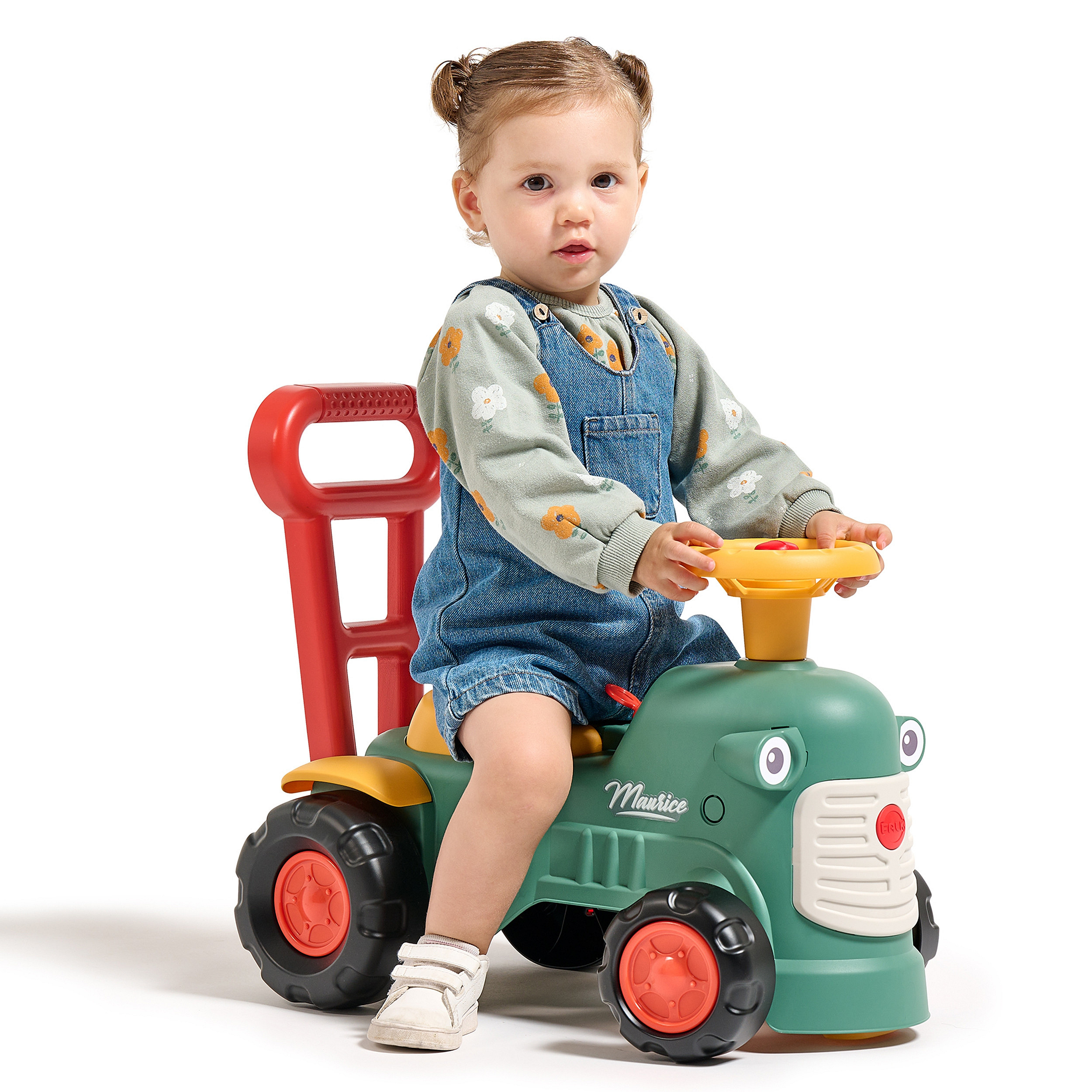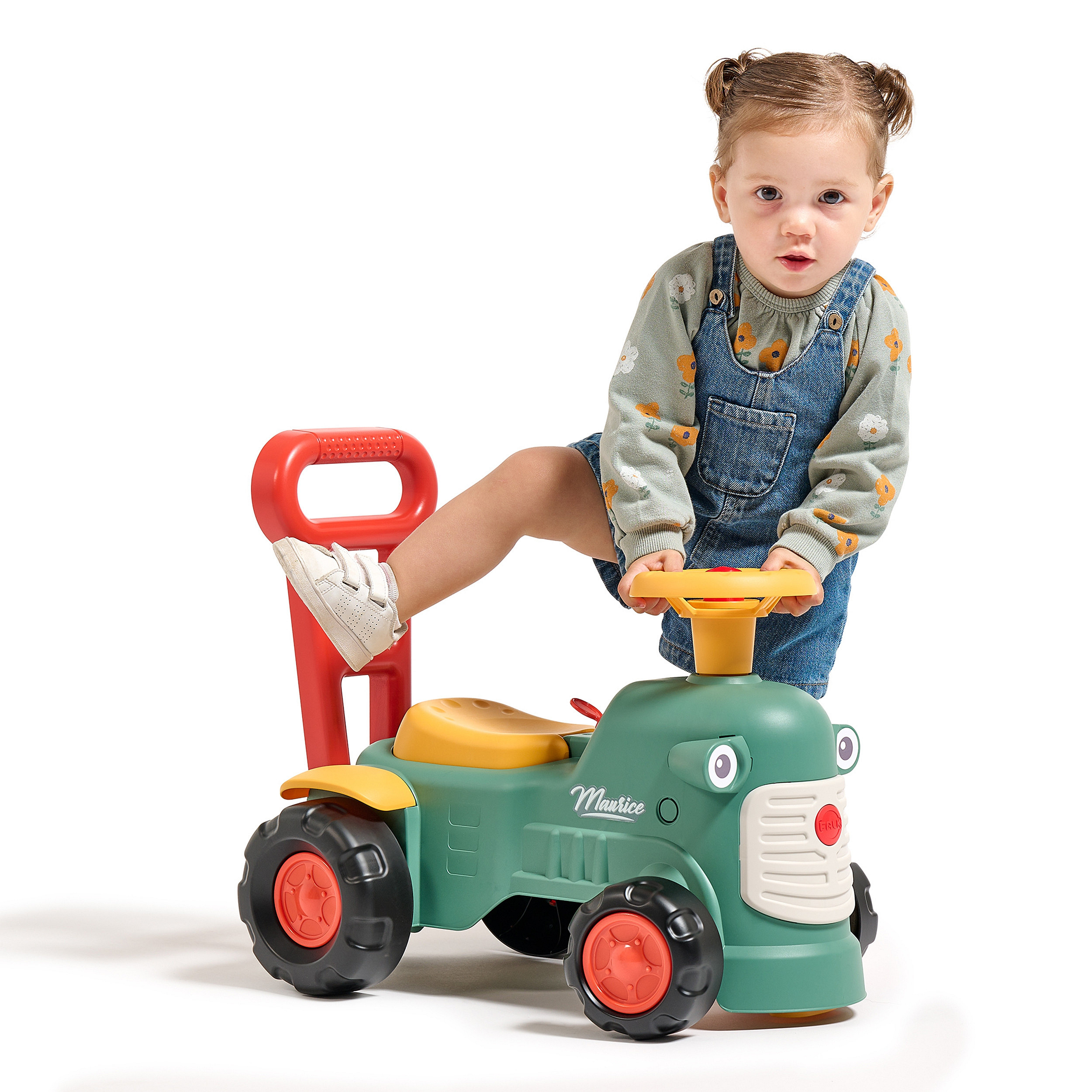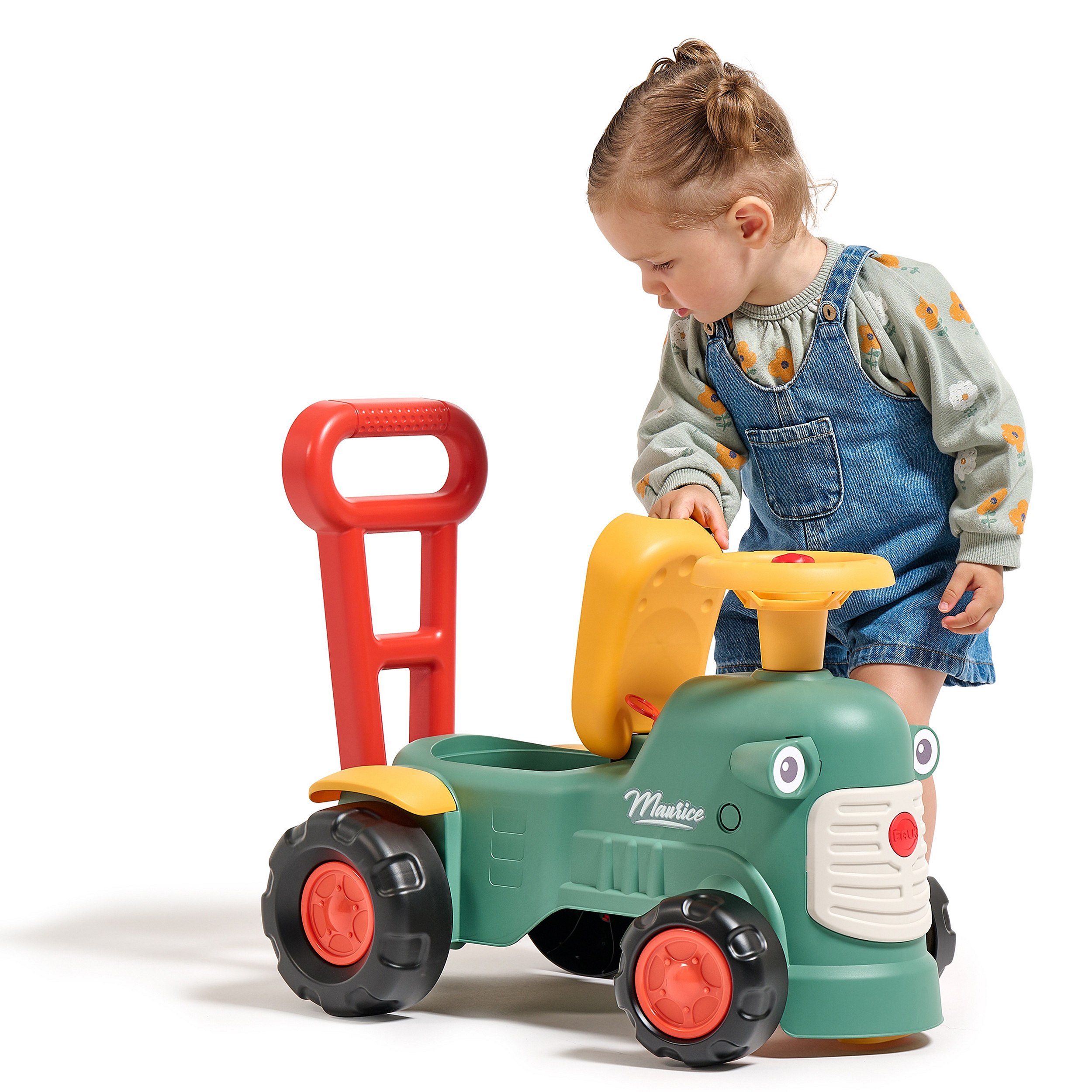 Roztomilý a plný nápaditosti odrážedlo traktůrek Maurice je ideálním společníkem pro děti od 12 měsíců až do jejich prvních krůčků. Díky speciální ergonomické rukojeti pomáhá malým dětem při učení chůze a dělání jistých kroků. Toto jedinečné vozidlo bylo vyrobeno ve Francii s využitím nejméně 90 % plastu pocházejícího z recyklace. Má volant s klaksonem, otevíratelnou skrýš na poklady, zvukový klíč a otočná kola, což zaručuje spoustu zábavy každý den. Hračka je zcela bezpečná pro nejmenší, protože neobsahuje škodlivé látky jako BPA, ftaláty ani PVC.