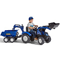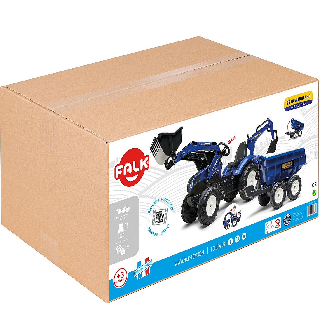Šlapací traktor New Holland T8 je impozantní stavební stroj od značky FALK, vytvořený pro malé dobrodruhy ve věku od 3 do 7 let. Toto modré vozidlo, označené referenčním číslem 3090W, je věrnou replikou modelu T8. Vyrobeno ze 100% ve Francii, představuje skutečnou platformu pro zábavu, která vydrží energii malých "dobrodruhů". Tato sada kombinuje funkce traktoru, bagru a nakladače, což zajišťuje hodiny kreativní aktivity na čerstvém vzduchu. Vozidlo je mimořádně všestranné díky bohaté výbavě. Vpředu se nachází pohyblivý nakladač (pelle frontale) a vzadu plně funkční rýpadlo (ekskawator), což umožňuje dítěti provádět komplexní zemní práce – kopání, nabírání a přenášení materiálů. Další výhodou je připojený přívěs typu "maxi" s funkcí sklápění (remorque basculante), který umožňuje přepravu písku, zeminy nebo kamenů bez omezení. Traktor je také vybaven otočným volantem, což usnadňuje manévrování při práci na "staveništi".