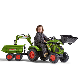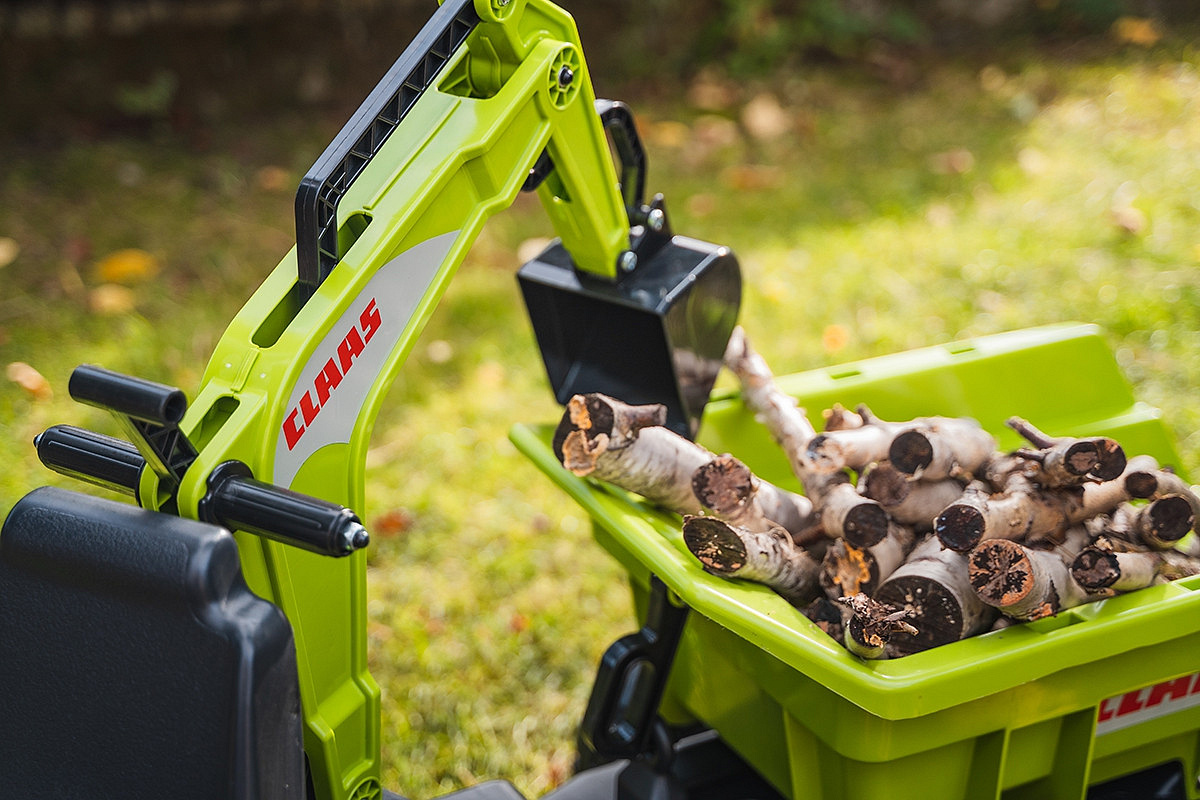 Toto jedinečné vozidlo je mnohem více než obyčejný šlapací traktůrek. Je to věrná replika modelu Claas Axos 330, vyrobená ze 100% ve Francii, která představuje kompletní platformu pro hraní pro malé objevitele. Konstrukce hračky je mimořádně pevná a vznikla z více než 60 % z recyklovaného plastu. Díky inovativnímu, otočnému sedadlu o 360 stupňů může dítě bleskově přepínat mezi řízením vozidla a obsluhou předního nakladače nebo zadního rypadla. Celkový dojem doplňuje dvouosý sklápěcí přívěs maxi, který umožňuje přepravu velkých nákladů, což činí hru v pískovišti nebo na zahradě ještě realističtější.