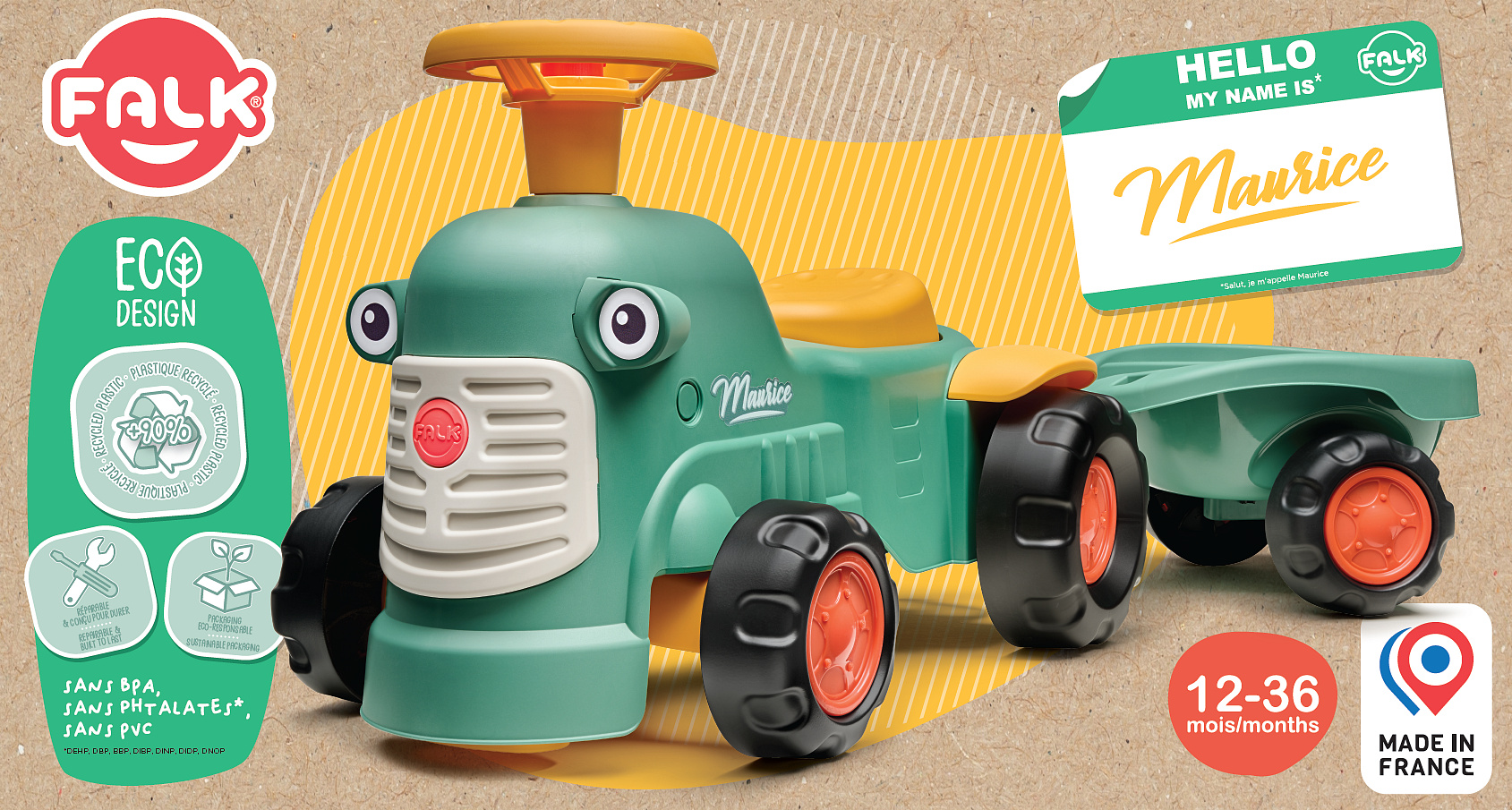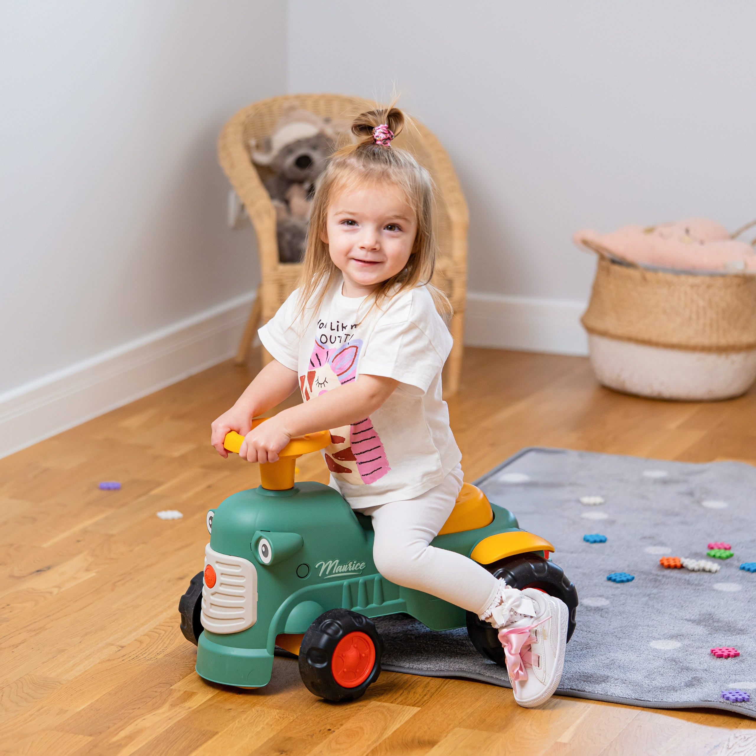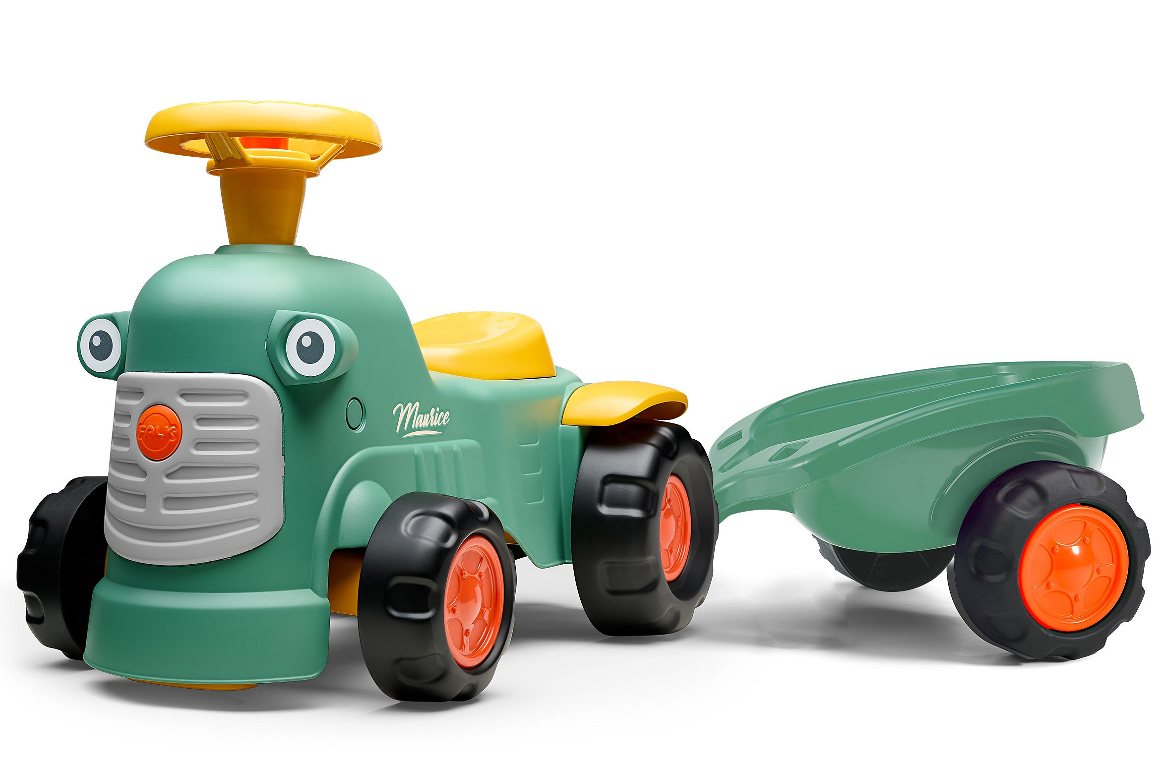 Jeździk Traktorek Maurice w kolorze w stylu vintage od marki FALK to uroczy i sprytny pojazd dla najmłodszych. Został wyprodukowany w 100% we Francji, a w trosce o naszą planetę do jego stworzenia użyto w 90% plastiku pochodzącego z recyklingu. Traktorek wyposażono w kierownicę z działającym klaksonem oraz niewielki kluczyk wydający dźwięki, co dostarcza dzieciom dodatkowej stymulacji sensorycznej. Dołączona do zestawu praktyczna przyczepa sprawia, że pojazd staje się idealnym towarzyszem podczas aktywnych zabaw w ogrodzie lub piaskownicy.