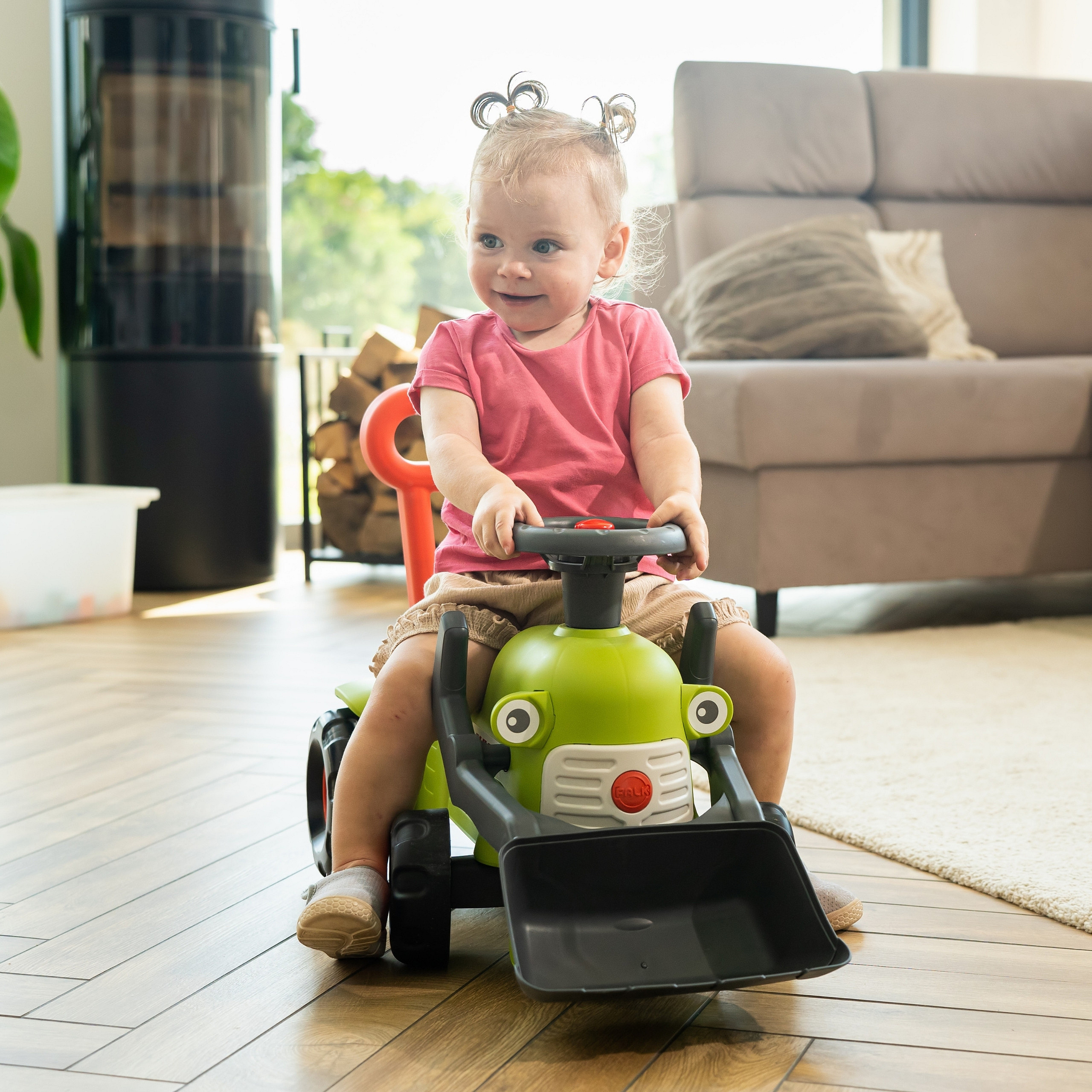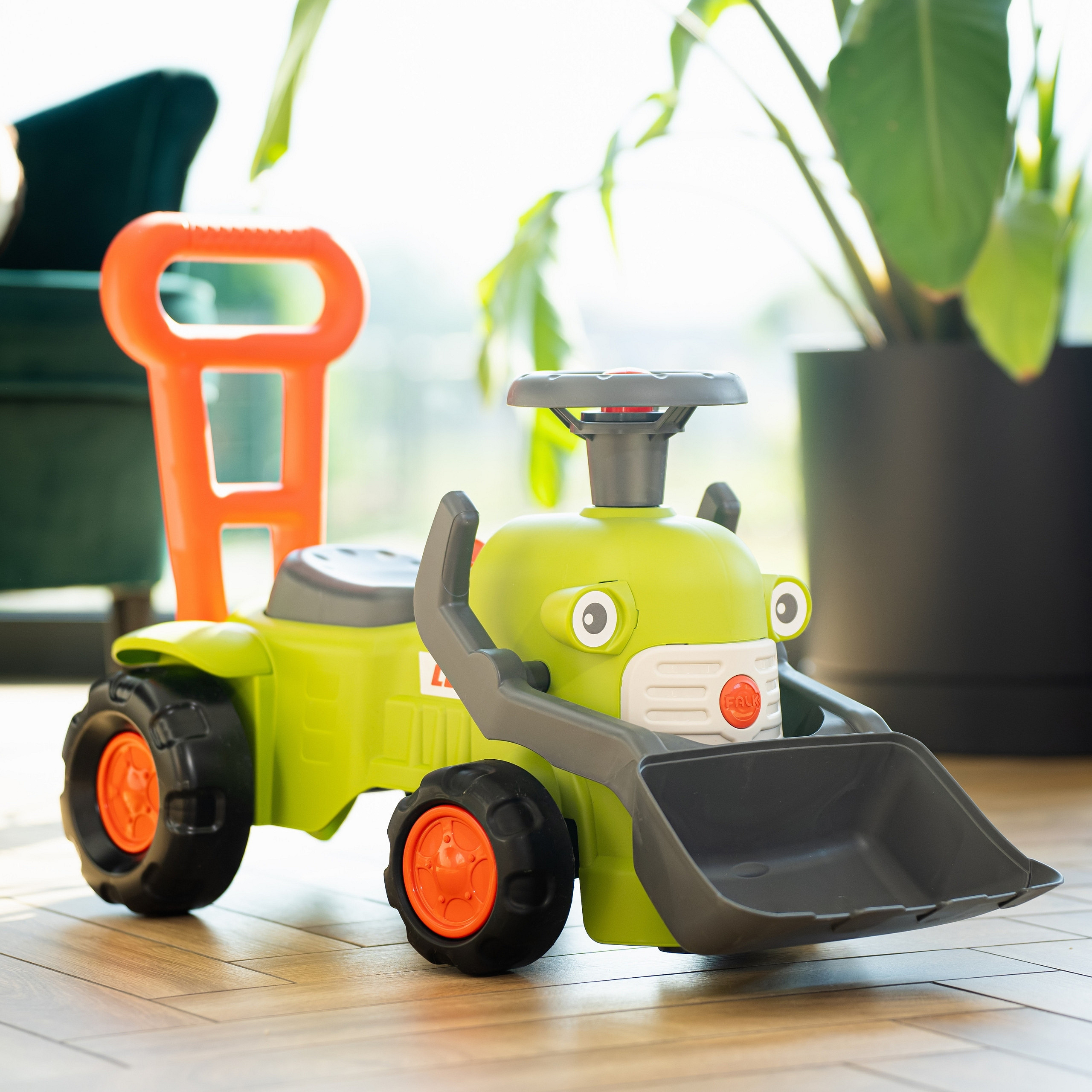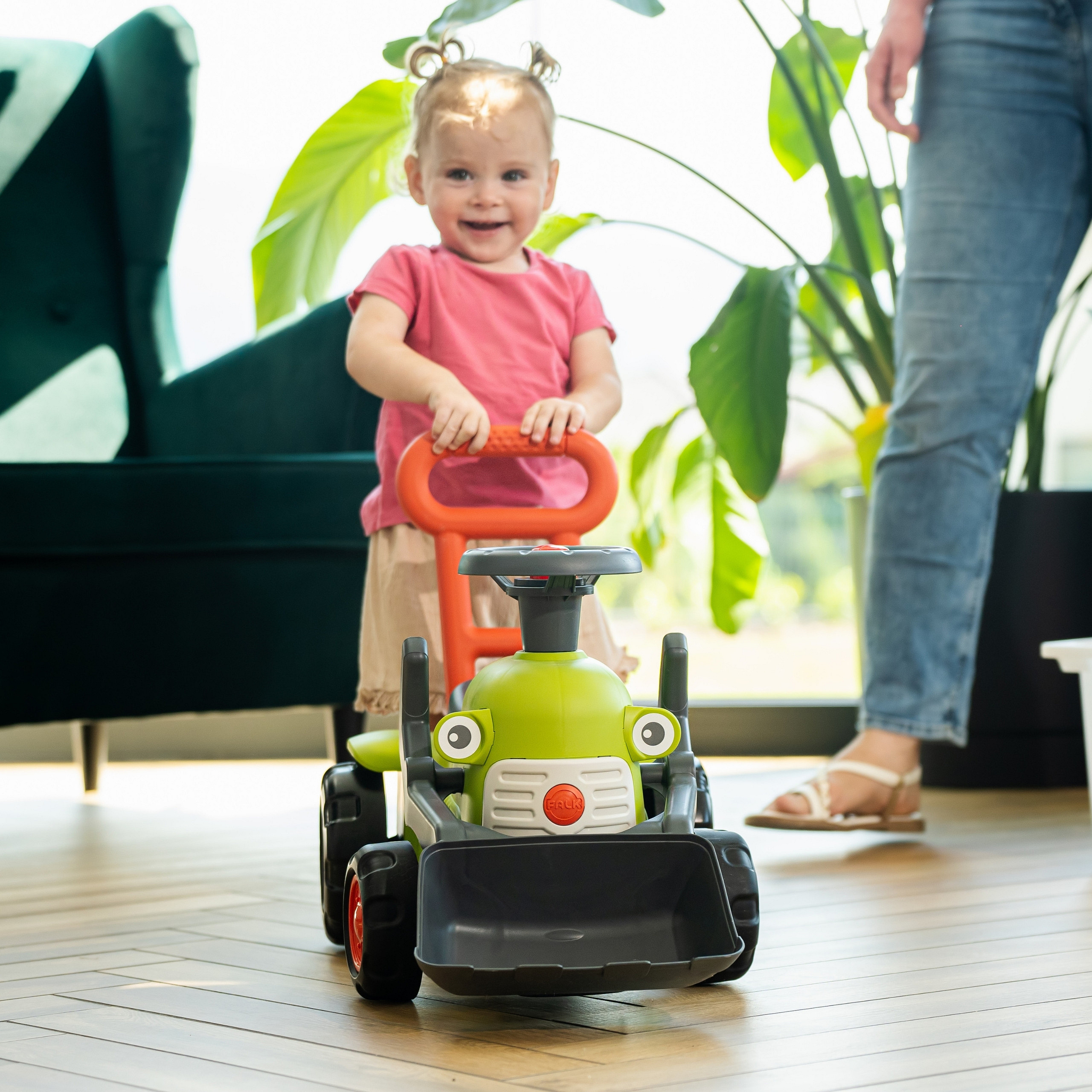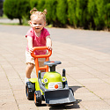 Traktor Claas Vintage Baby od marki Falk to uroczy i sprytny jeździk z ładowaczem, który doskonale sprawdzi się jako pomoc w stawianiu pierwszych kroków dla najmłodszych miłośników maszyn rolniczych. Ten mały jeździk towarzyszy dziecku już od 12 miesiąca życia, wspierając jego rozwój ruchowy. Wyposażony jest w ergonomiczną rączkę do pchania, pełniącą funkcję chodzika. Posiada w pełni funkcjonalny ruchomy ładowacz czołowy, który zwiększa atrakcyjność zabawy, pozwalając na załadunek i rozładunek. Ponadto, kierownica z wbudowanym klaksonem i mały dźwiękowy klawisz stanowią fantastyczne źródło stymulacji. Produkt jest w 100% wyprodukowany we Francji i wykonany w co najmniej 90% z plastiku z recyklingu, co czyni go wyborem przyjaznym dla środowiska.