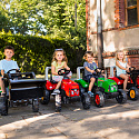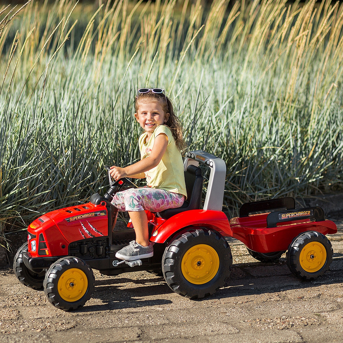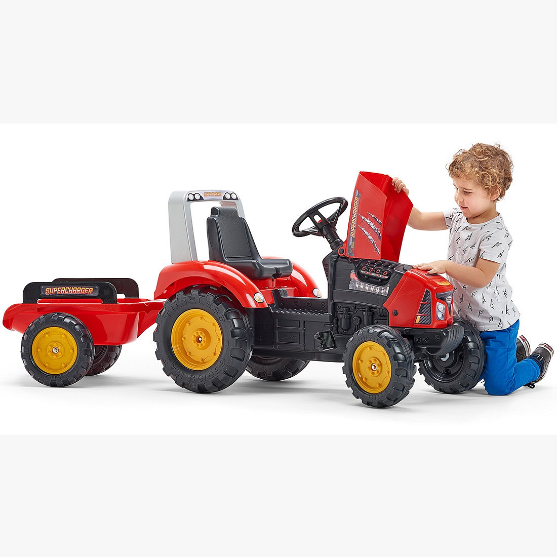 Šlapací traktor Supercharger od značky FALK v červené barvě je snem každého malého zahradníka a fanouška zemědělských strojů. Toto solidní vozidlo bylo z 100% vyrobeno ve Francii, což zaručuje nejvyšší kvalitu zpracování a péči o detaily. Traktor se vyznačuje realistickým designem, který přitahuje pozornost a povzbuzuje k aktivní hře na čerstvém vzduchu. Vybaven otevíratelnou přední kapotou, umožňuje dítěti cítit se jako skutečný mechanik kontrolující stav motoru před vyjetím na pole. V sadě se nachází prostorný, jednoosý přívěs, který je ideální pro přepravu písku, listí nebo oblíbených hraček. Díky otočné přední nápravě a volantu s vestavěným klaksonem je manévrování traktorem snadné a přináší spoustu zábavy. Supercharger není jen hračka, ale nástroj pro budování fyzické kondice a pohybové koordinace dítěte, zajišťující bezpečnou zábavu po mnoho sezón.