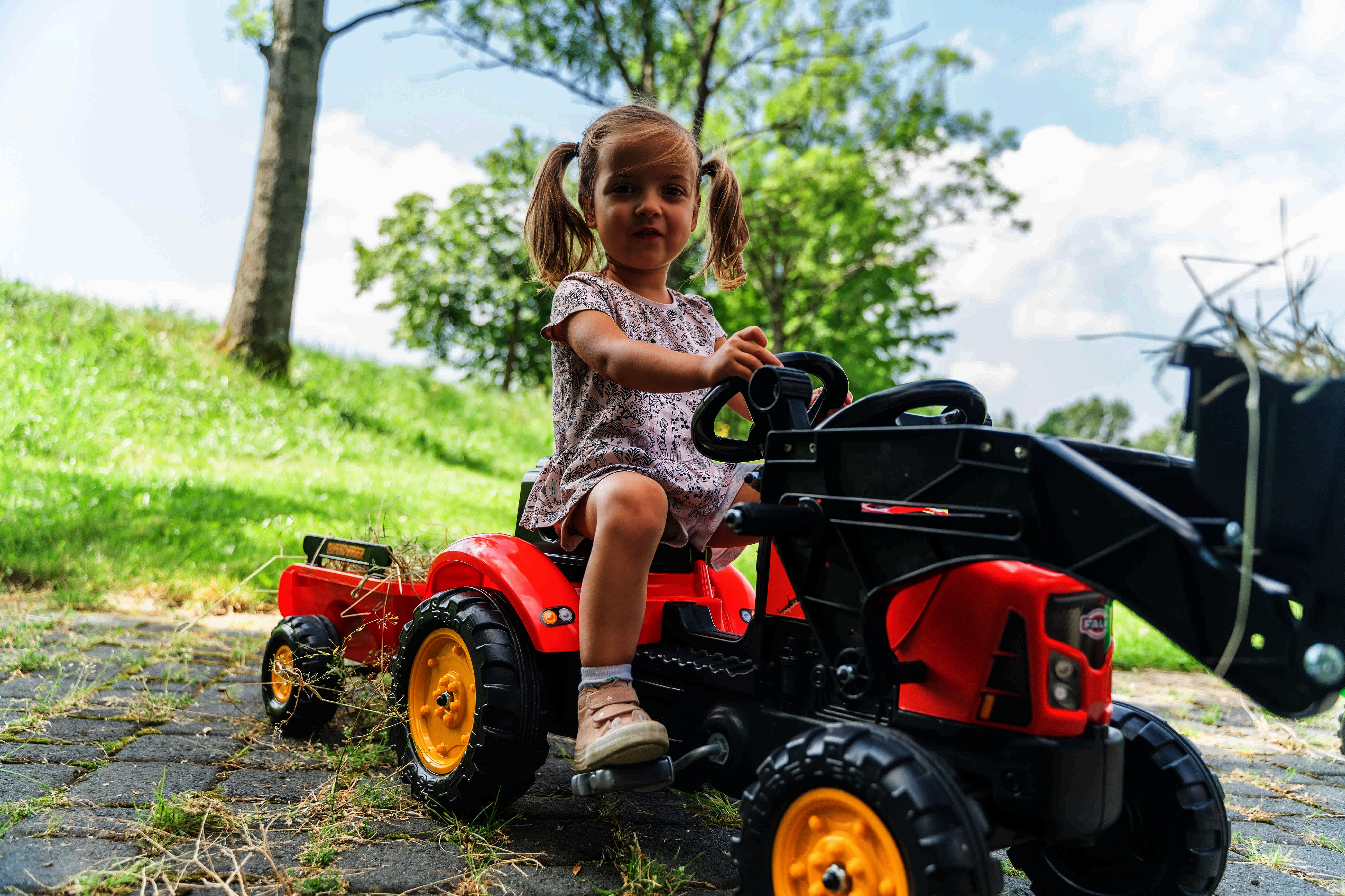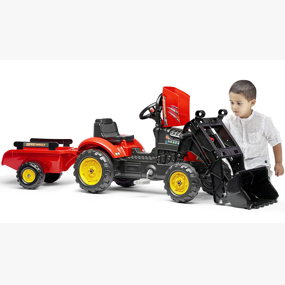 Traktor-bagr na pedály Supercharger Red od renomované značky FALK je skvělá hračka pro malé milovníky stavebních a zemědělských strojů. Navržen s důrazem na detaily, vybaven funkční, pohyblivou přední lžící a velkým přívěsem s vysokou kapacitou, který snadno pojme písek, listí nebo kameny. Realistickou zábavu posiluje otevíratelná kapota, která poskytuje přístup k "motoru", a volant s klaksonem. Vyrobeno zcela ve Francii, z 40% z recyklovaného plastu, zaručuje hodiny bezpečné zábavy na čerstvém vzduchu.