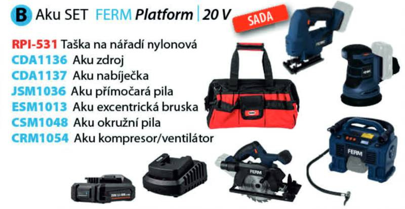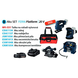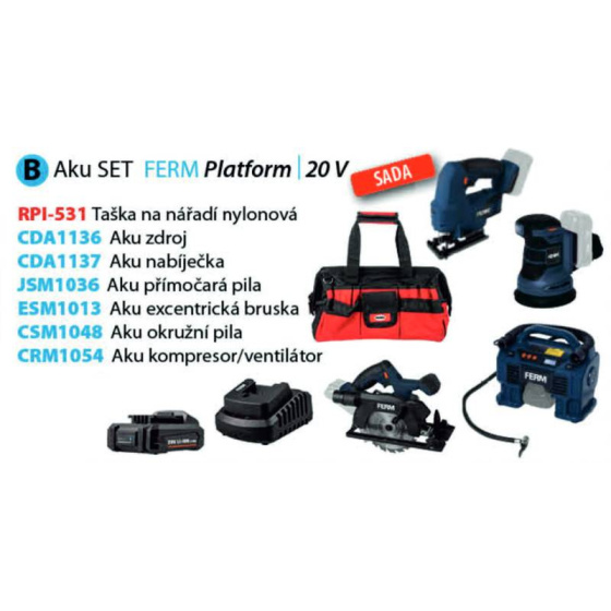 Ferm aku sada nářadí B, taška RPI-531, přímočará pila JSM1036, excentrická bruska ESM1013, okružní pila CSM1048, kompresor CRM1054, zdroj 2.0Ah CDA1136, nabíječka CDA1137