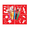 Balení obsahuje 6 barevných foukacích fixů s potiskem a 4 barevné papírové šablonky v oblíbených poh